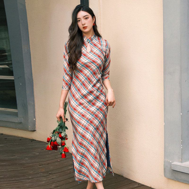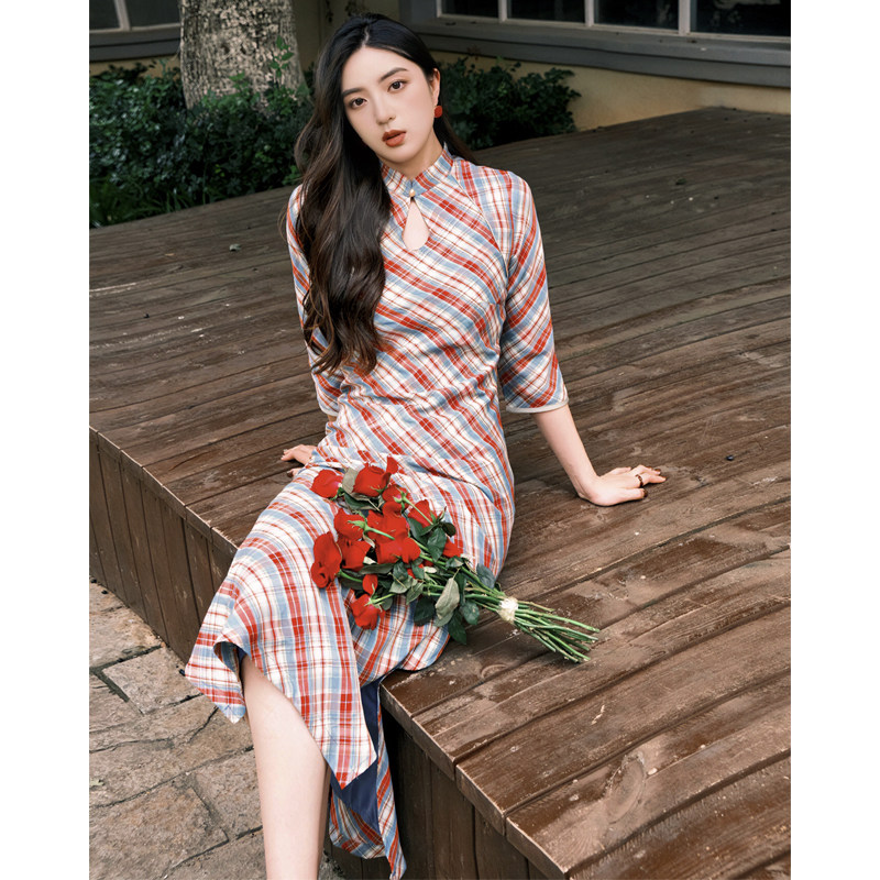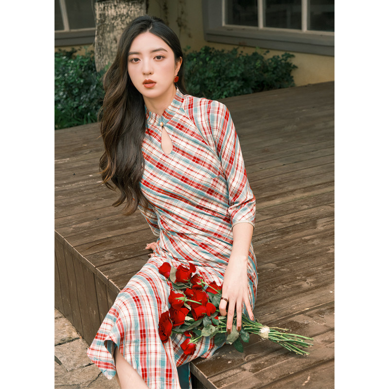 JUJU定制秋季复古格纹改良旗袍女秋季新中式撞色连衣裙收腰长裙