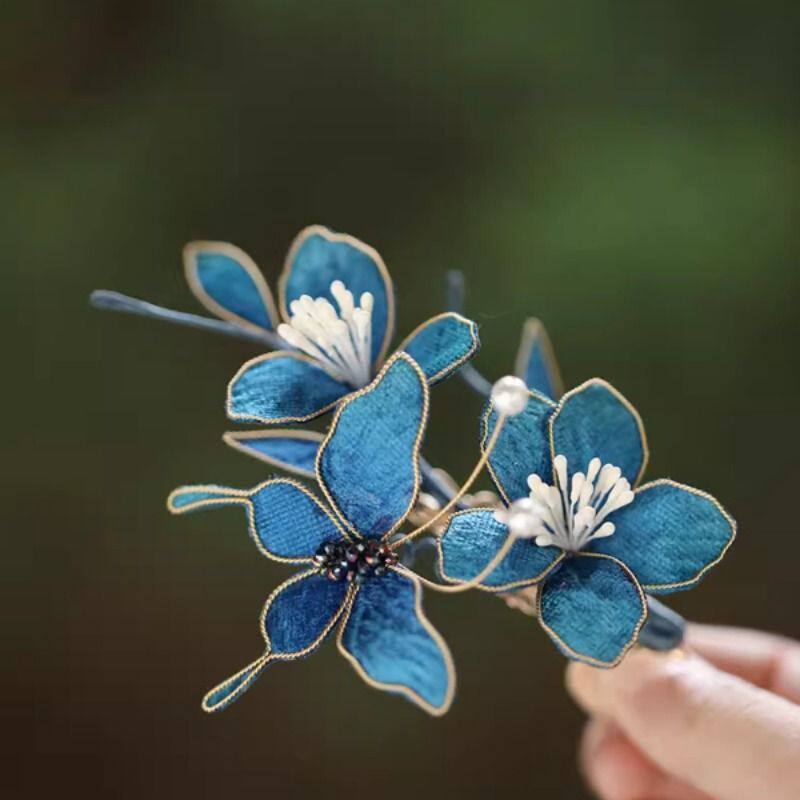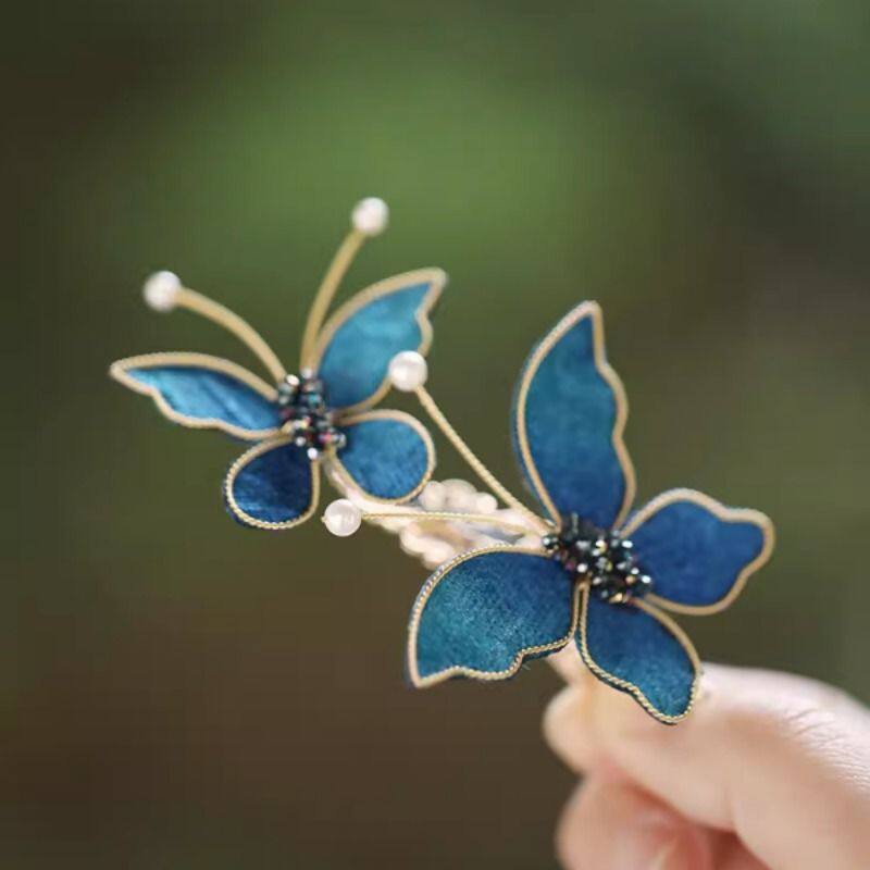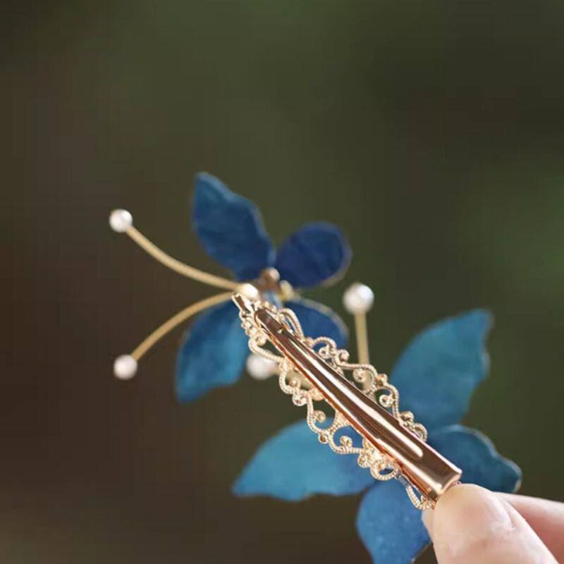 清汉女头饰国风蓝色蝴蝶高级感手工掐丝发夹旗袍配饰小边夹花朵