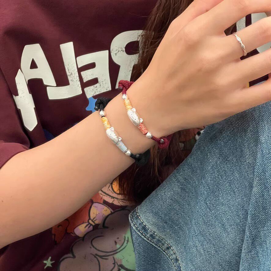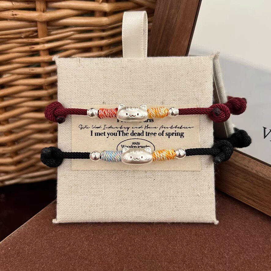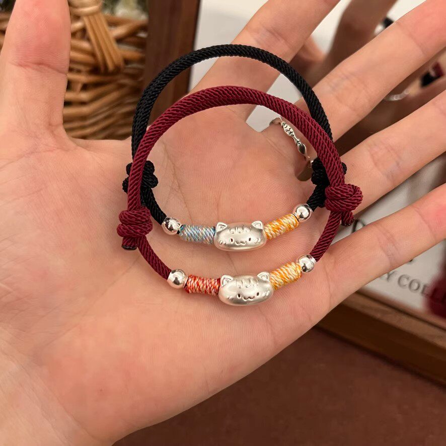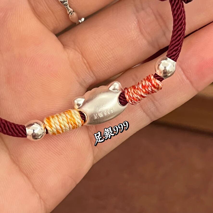 999足银法棍猫手链纯银男女生情侣手绳闺蜜送礼物红绳银饰品编织