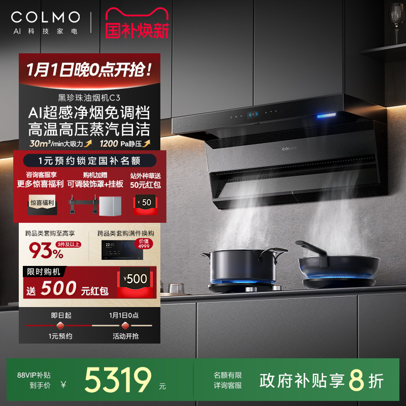 COLMO黑珍珠抽油烟机C3家用燃气灶厨房30m³大吸力蒸汽洗AI免调档