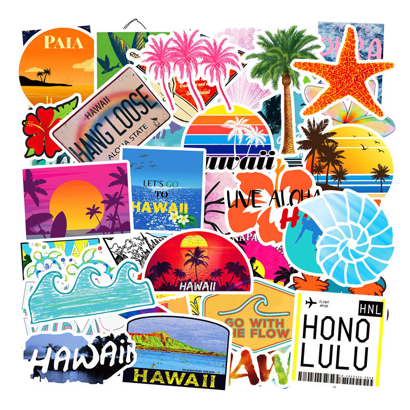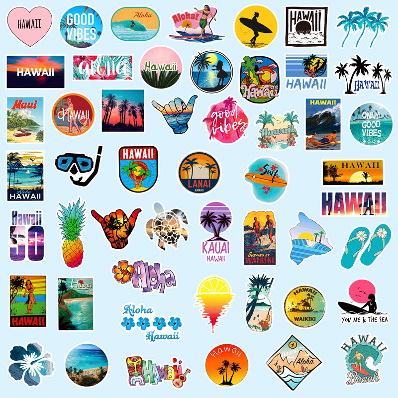 100张hawall夏威夷户外旅行风景旅行箱贴纸沙滩冲浪度假拉杆箱冰箱笔记本电脑电动车汽车摩托车涂鸦aloha贴画