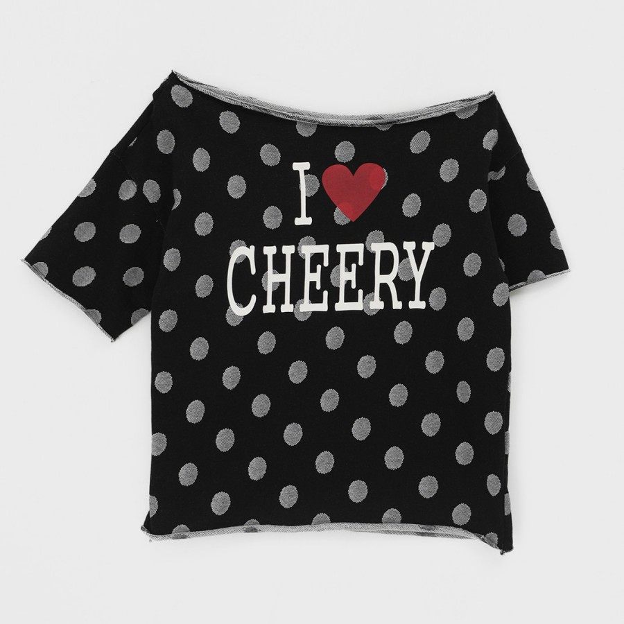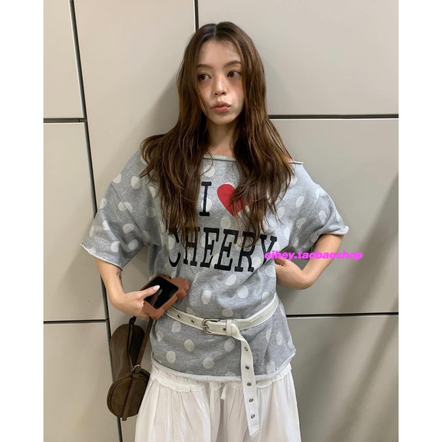 eihey诶嘿25夏季字母圆点印花露肩斜肩性感宽松短袖卷边慵懒风T恤