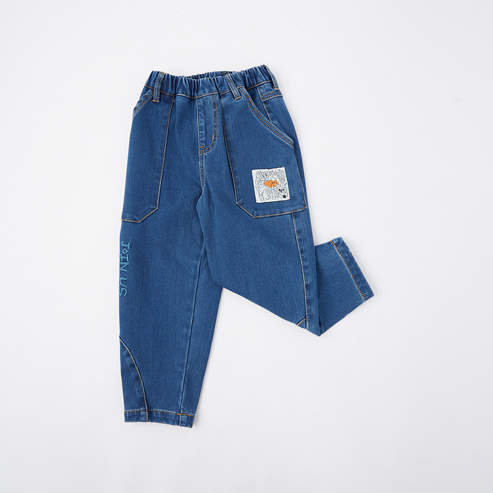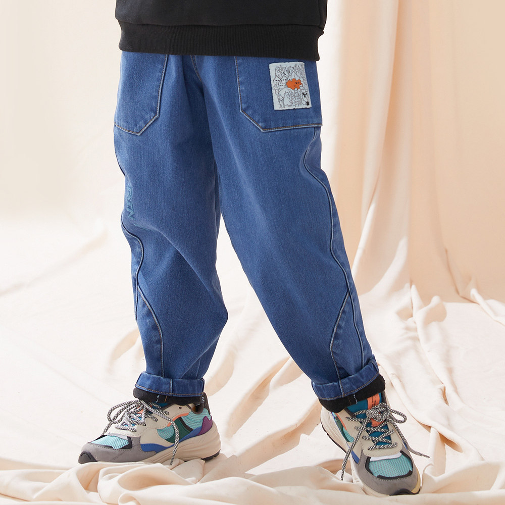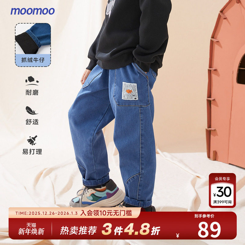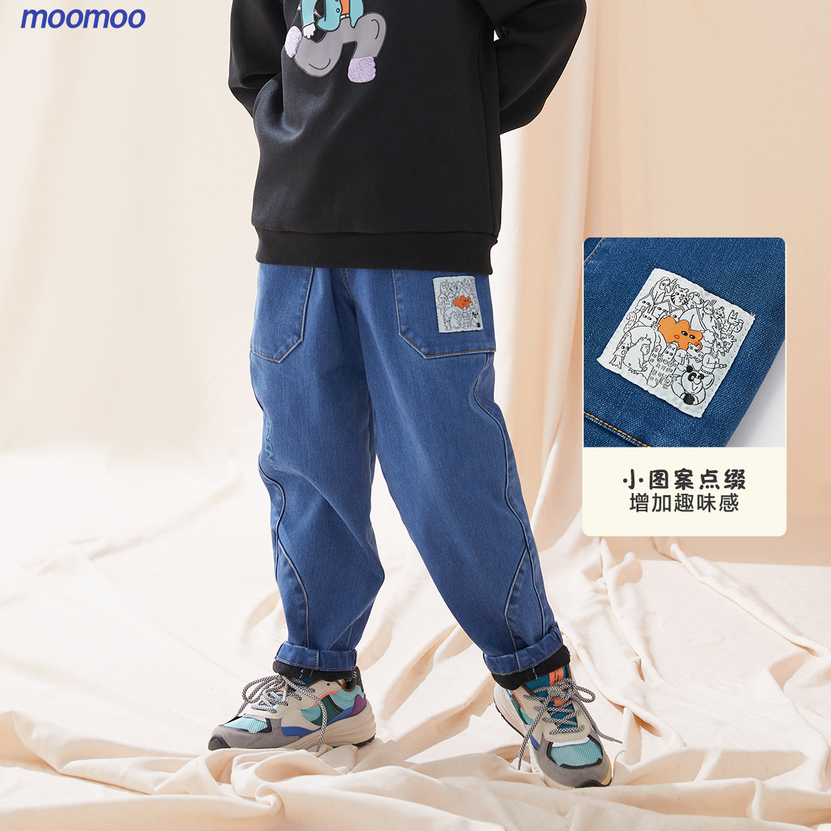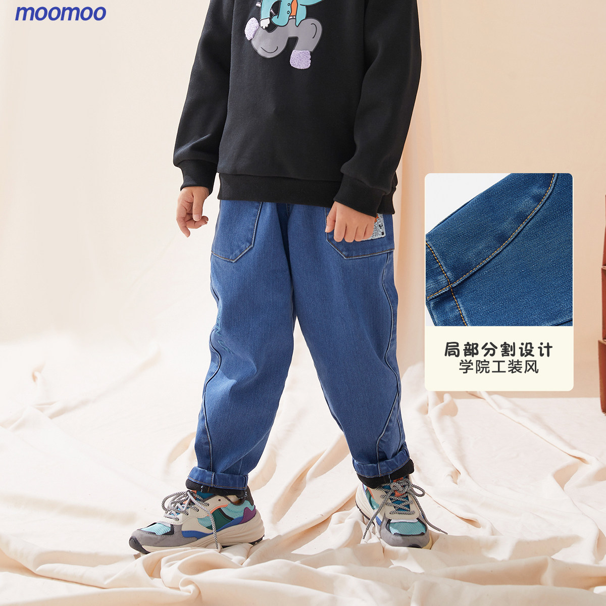 moomoo童装中童廓形牛仔裤秋冬抓绒儿童耐磨裤子长裤舒适百搭下装