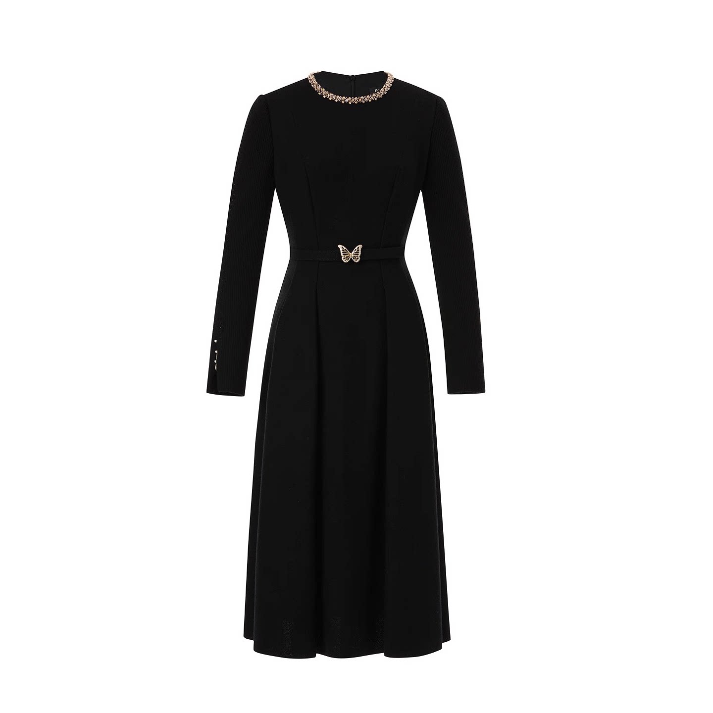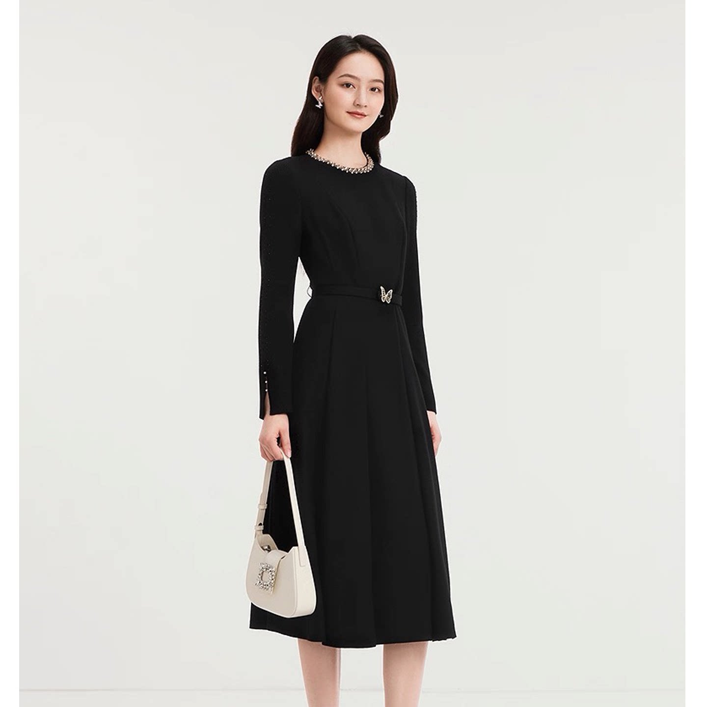 珂莱商场同款2025秋冬季新款女装圆领收腰钉珠中长款羊毛呢连衣裙