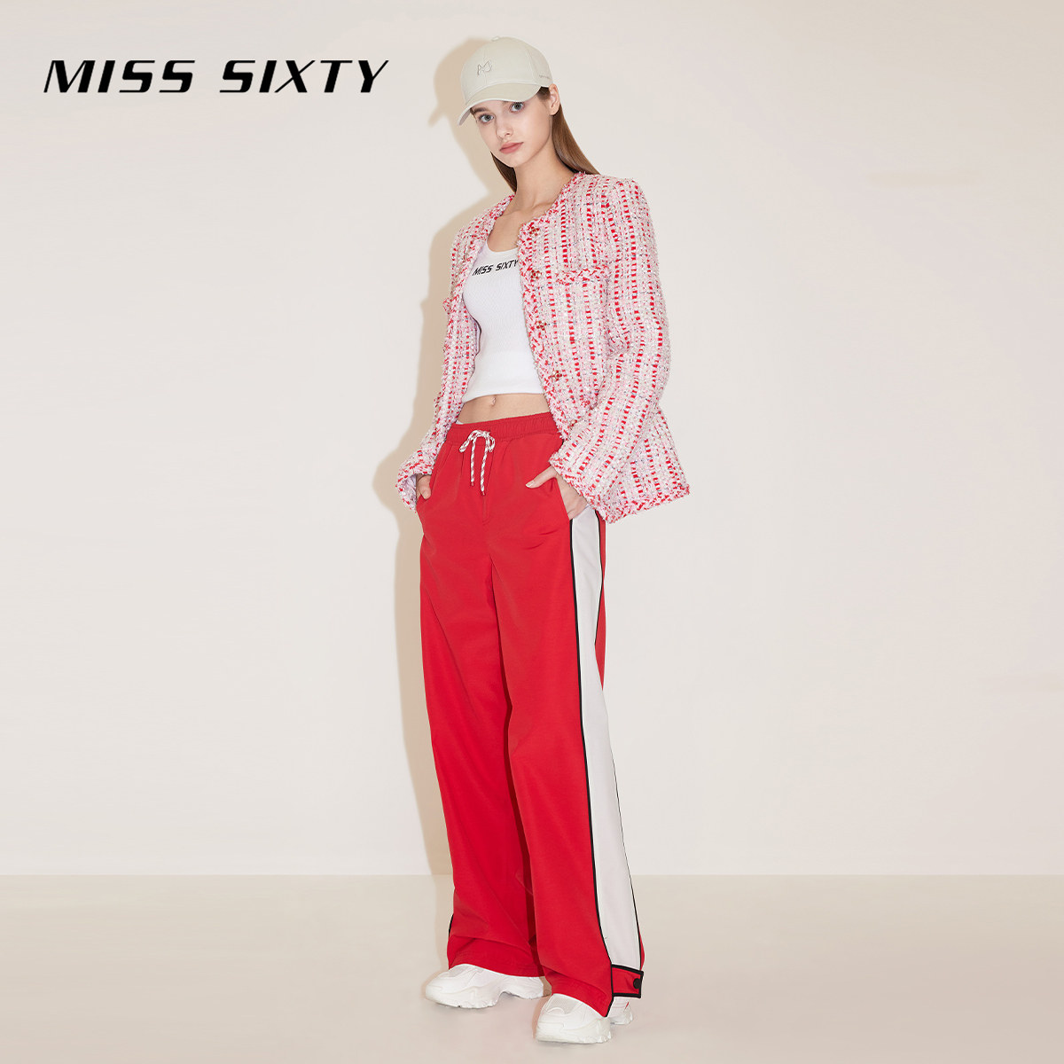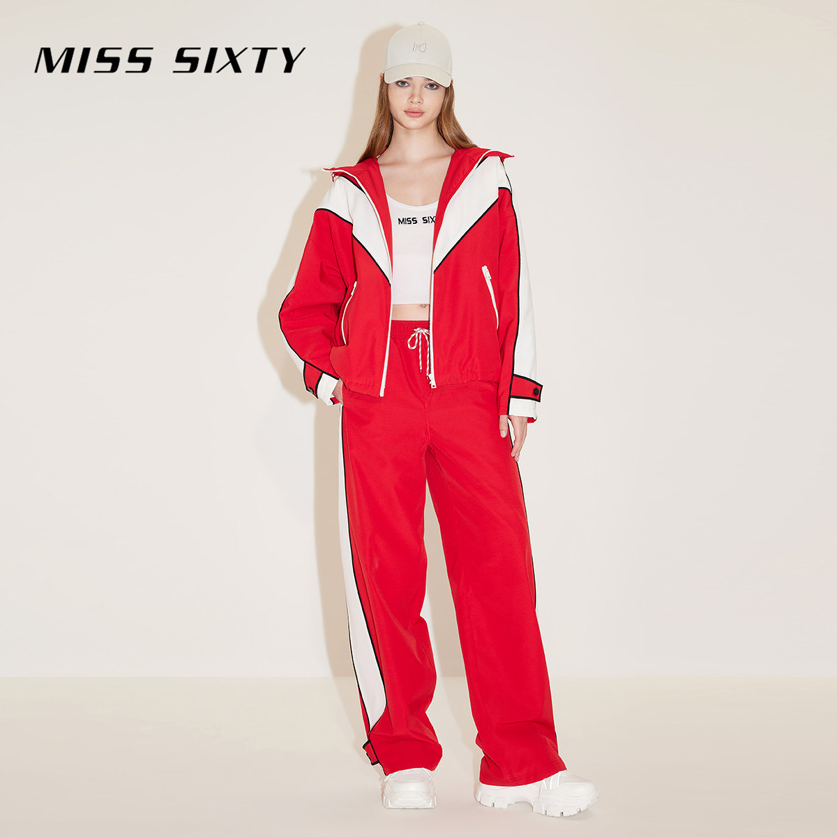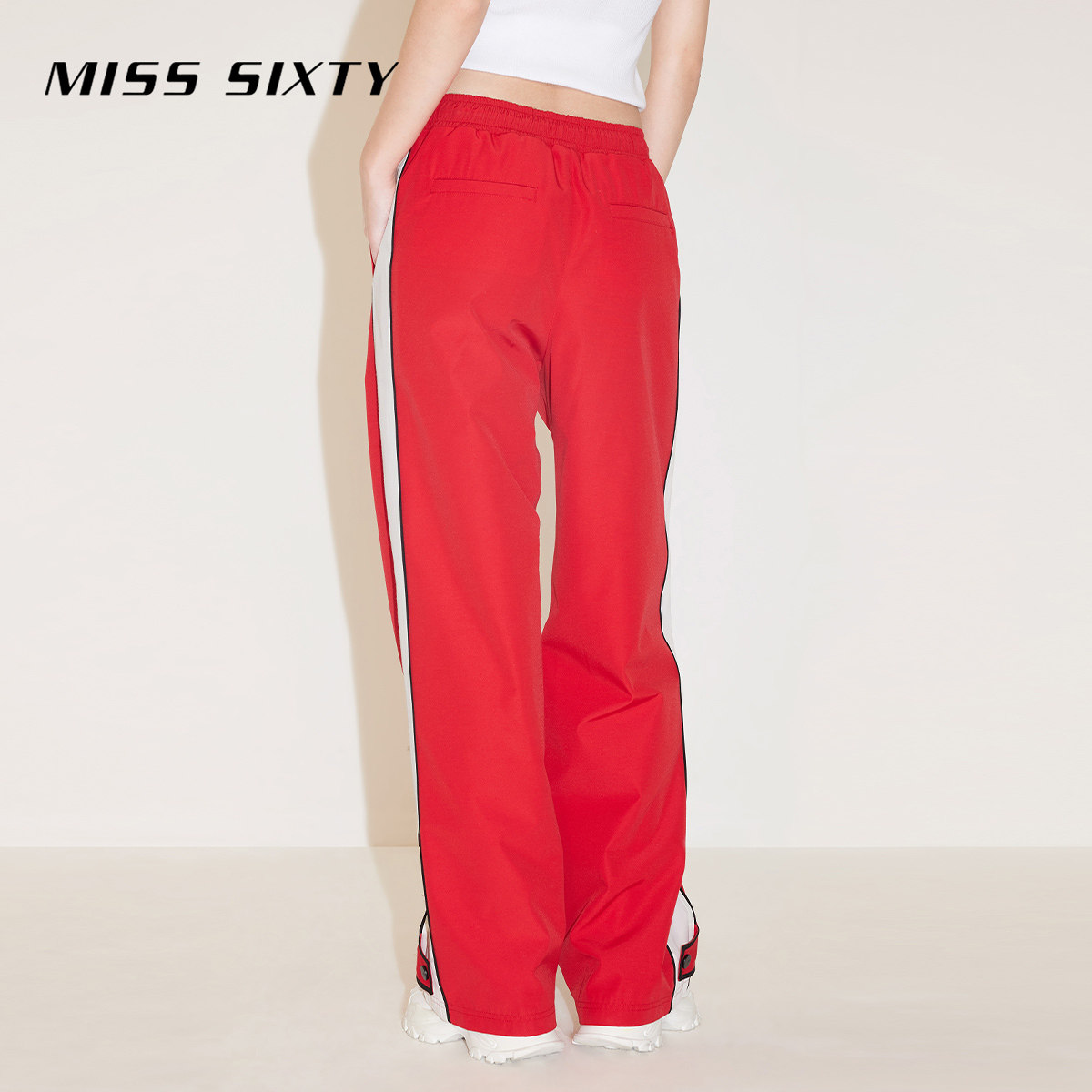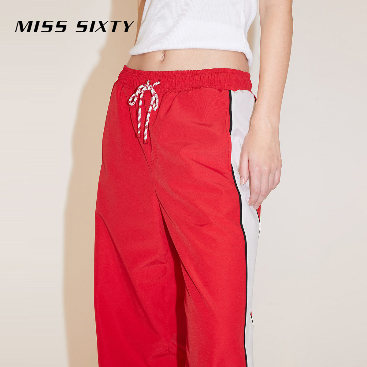 Miss Sixty春秋简约百搭运动休闲长裤女系带宽松阔腿裤拼接大红色