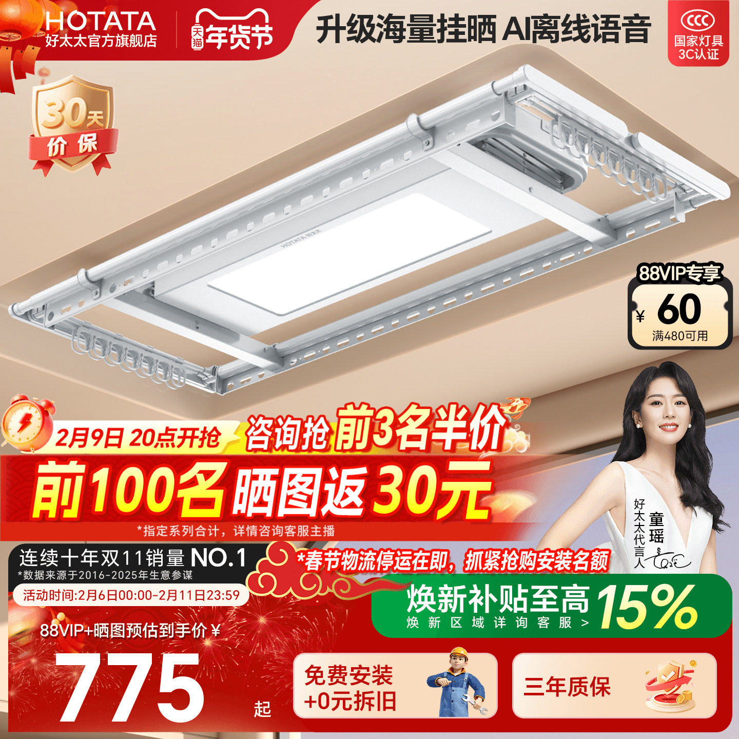 好太太电动晾衣架阳台家用遥控升降晒衣架智能超薄自动晾衣杆神器