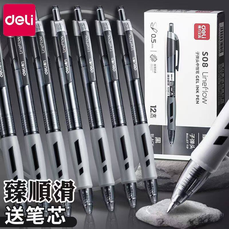 得力S08按动中性笔0.5mm子弹头臻顺滑中性笔按动碳素笔水笔签字笔学生考试办公文具按动笔水笔