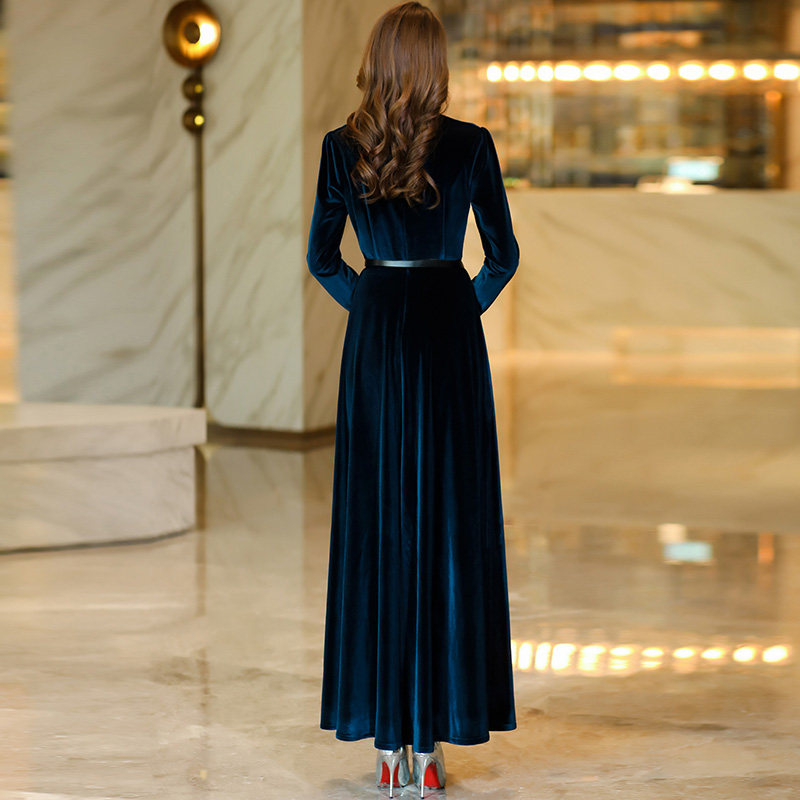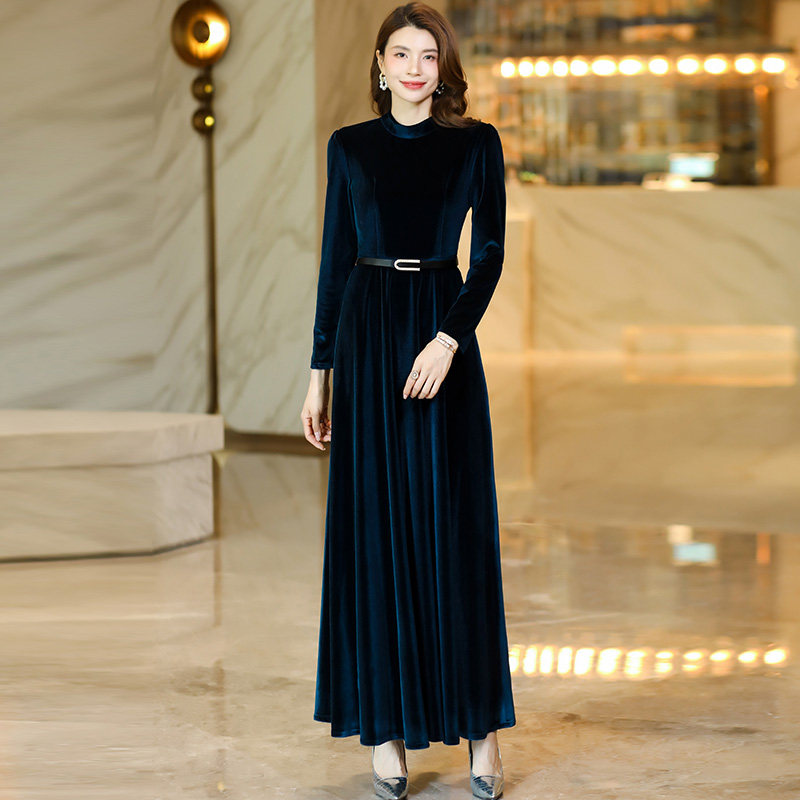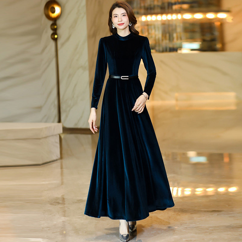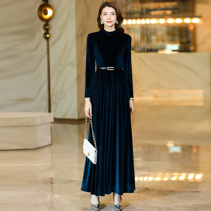 2025新款秋冬长袖圆领纯色丝绒连衣裙妈妈款修身显瘦小个子长裙子