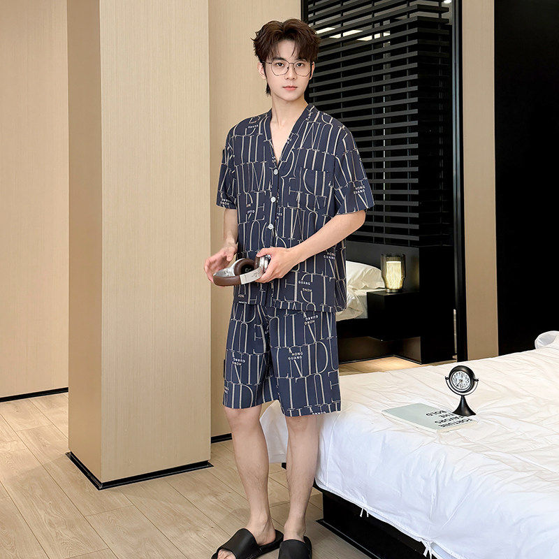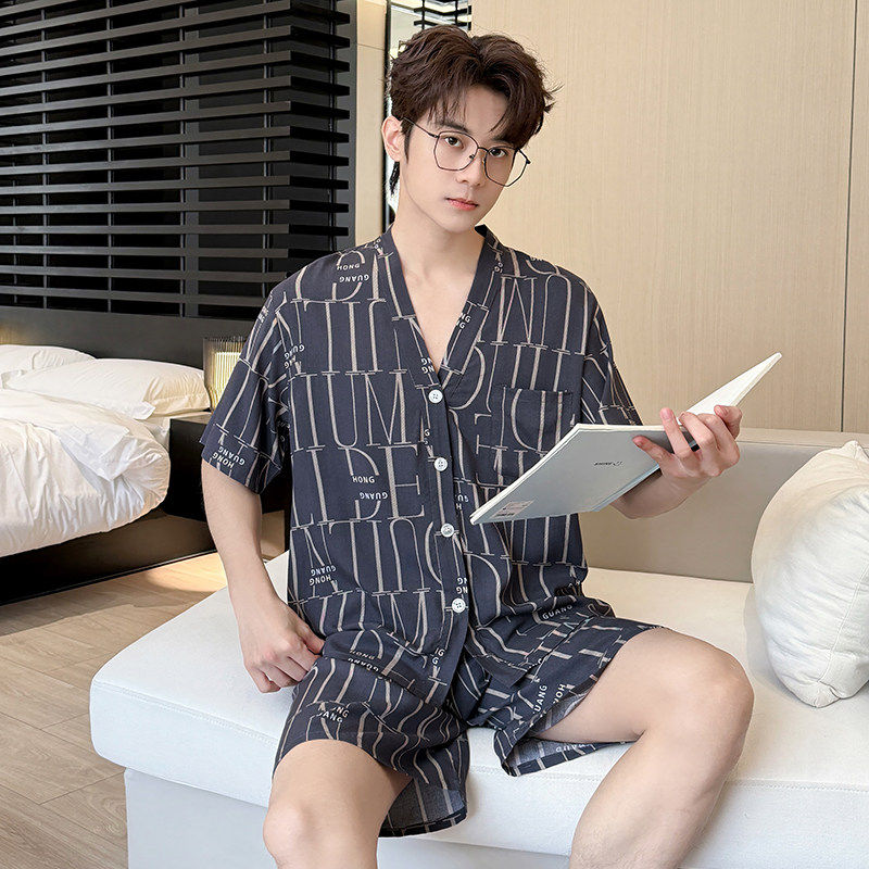 红豆夏季新款短袖棉绸睡衣加大码宽松家居服套装男款透气人造棉家