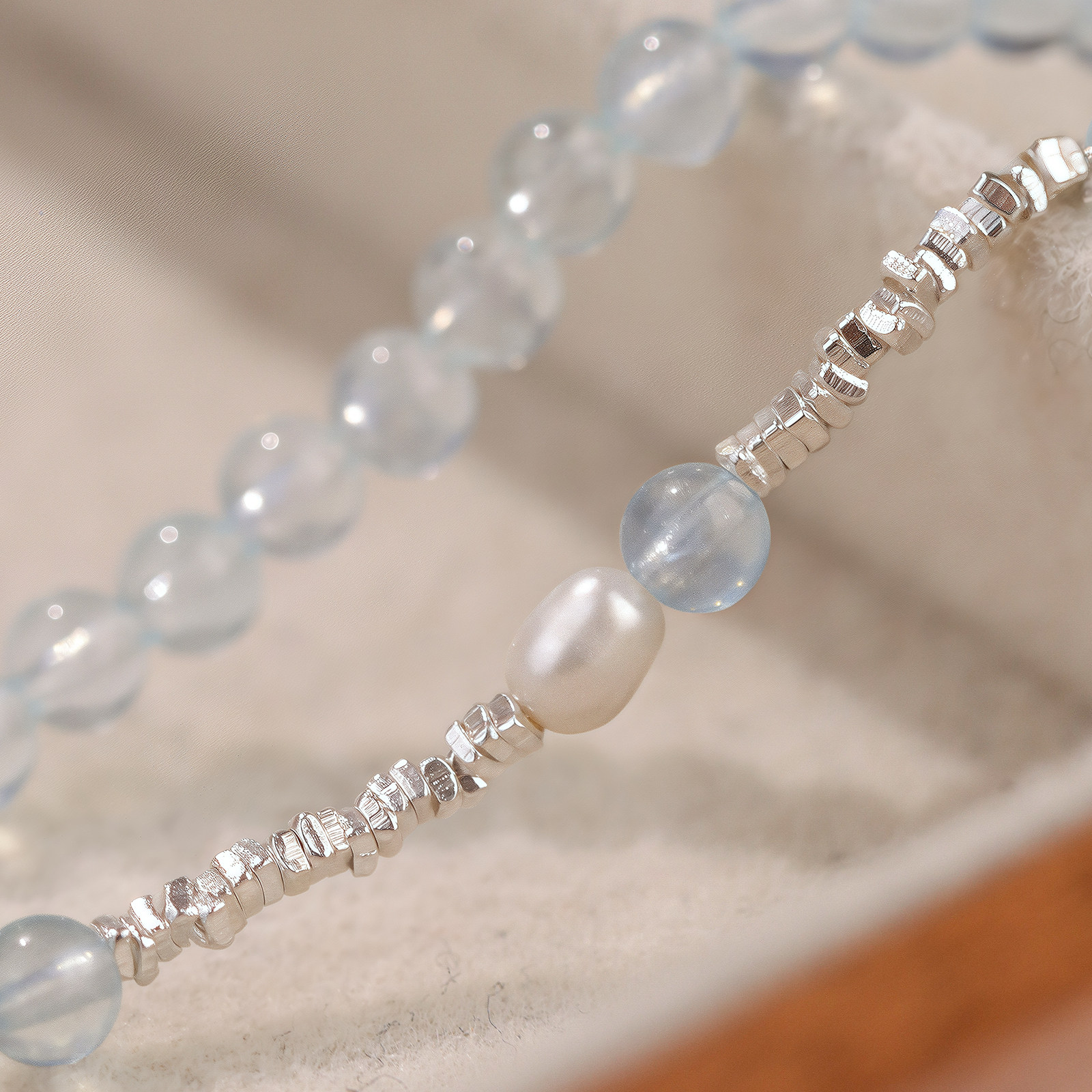 海辰天然海蓝宝水晶手串纯银珍珠手链女款正品轻奢小众碎银三圈