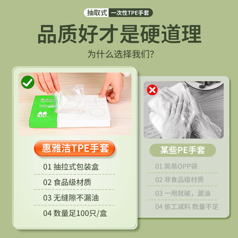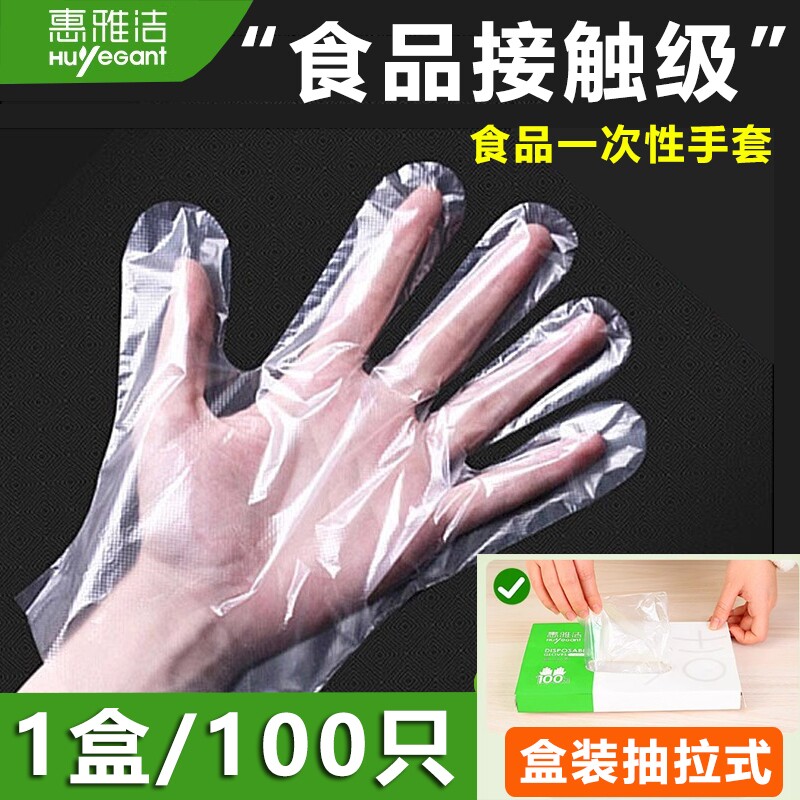 惠雅洁一次性成人手套餐饮食品级手膜加厚透明PE塑料薄膜盒装抽取