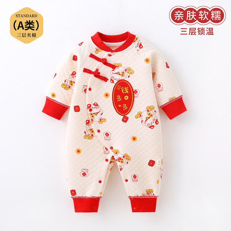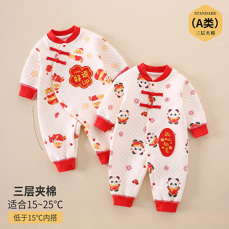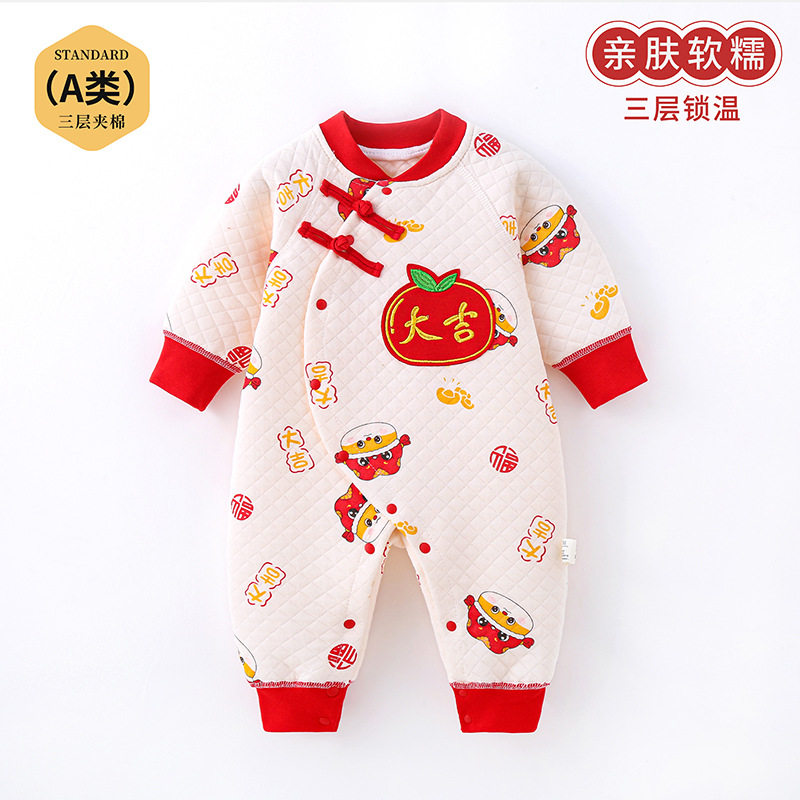 新生儿衣服春秋婴儿中国风百日宴纯棉连体衣宝宝夹棉保暖满月哈衣