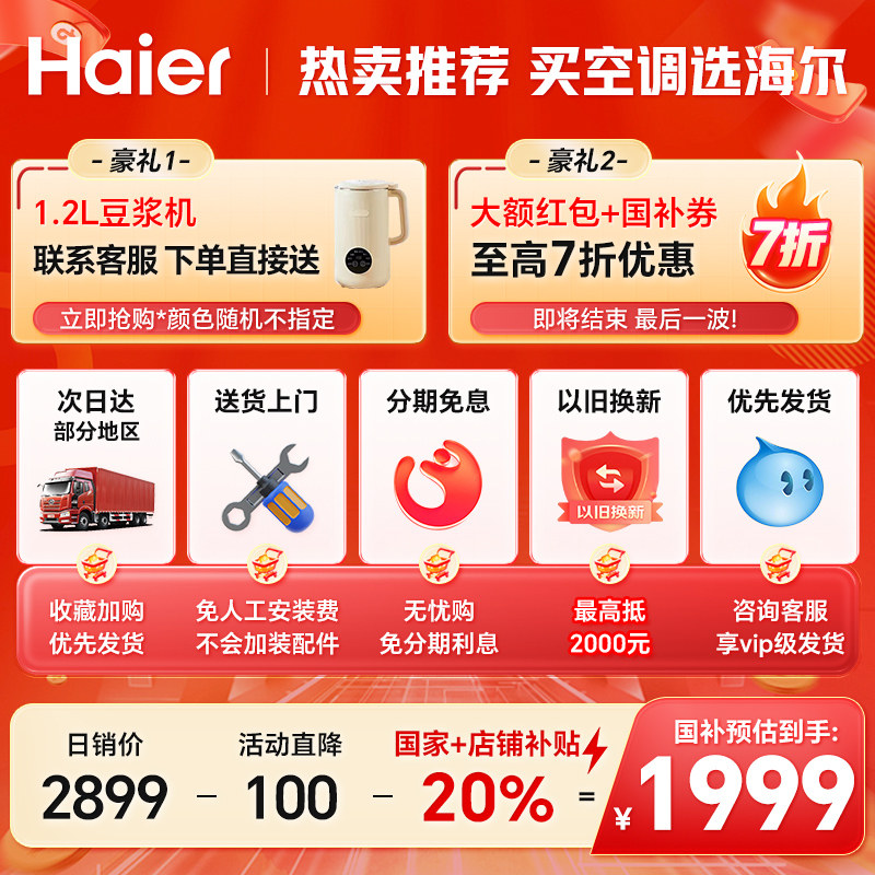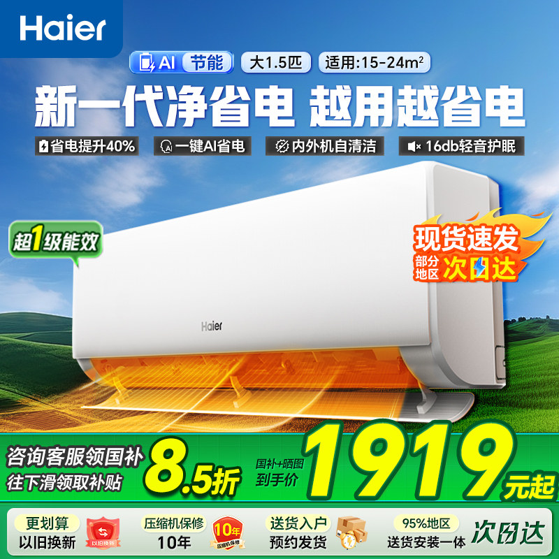 政府补贴20%海尔空调净省电1.5匹一级能效变频冷暖家用空调挂机