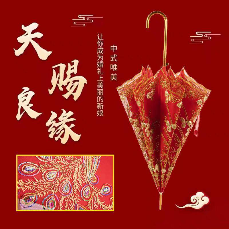 结婚红伞婚伞新娘出嫁伞红色婚庆用新款中式婚礼复古蕾丝长柄喜伞