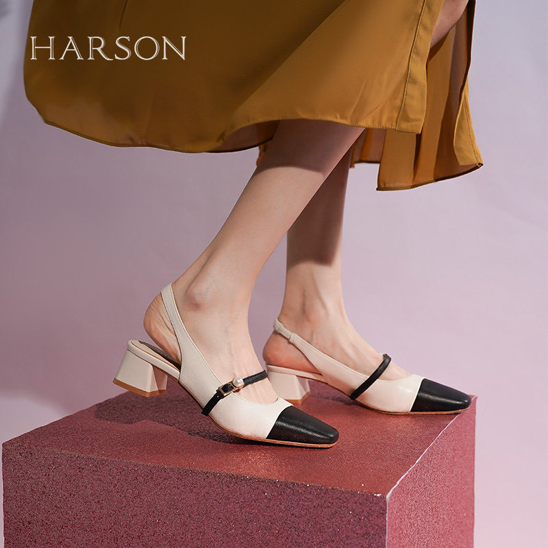 哈森包头凉鞋女夏季新款复古小香风拼色粗跟玛丽珍女鞋HM222509