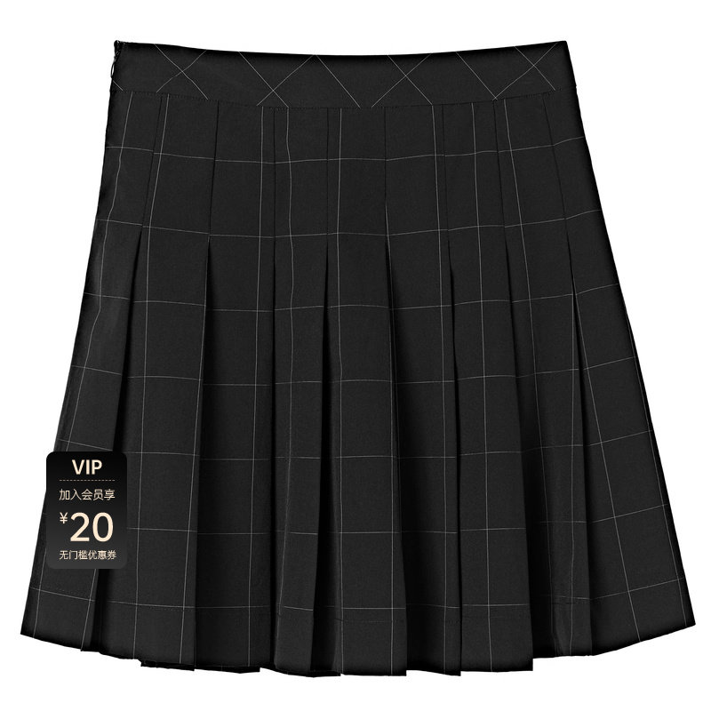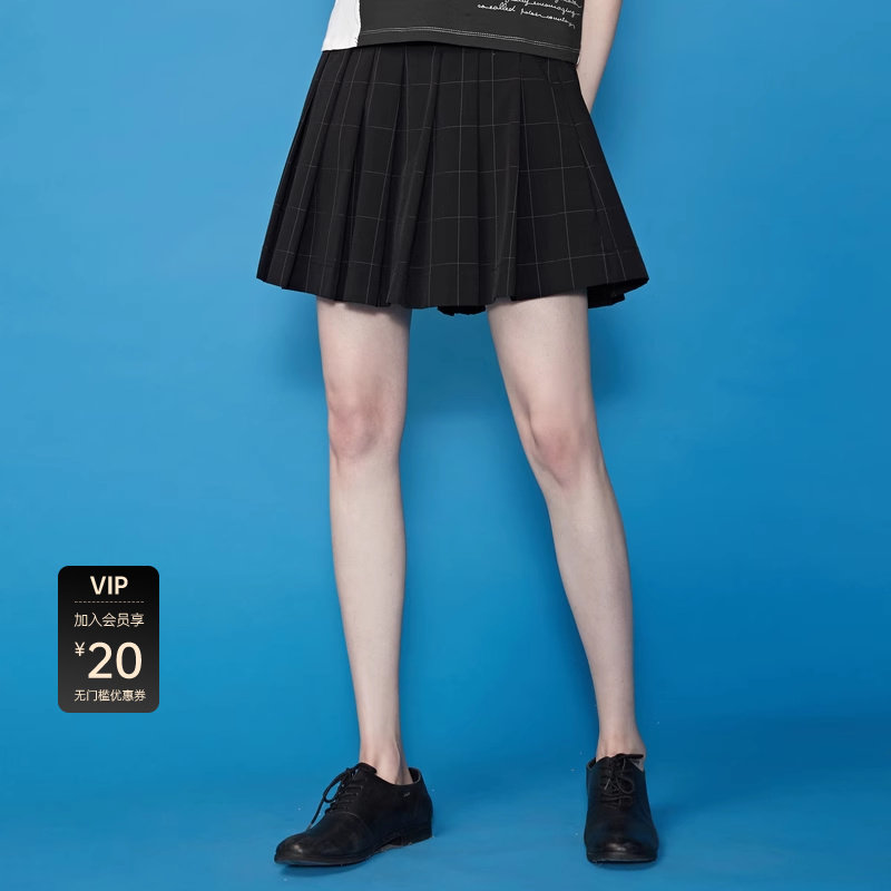 休闲高腰 撞色格纹 百褶短裙
