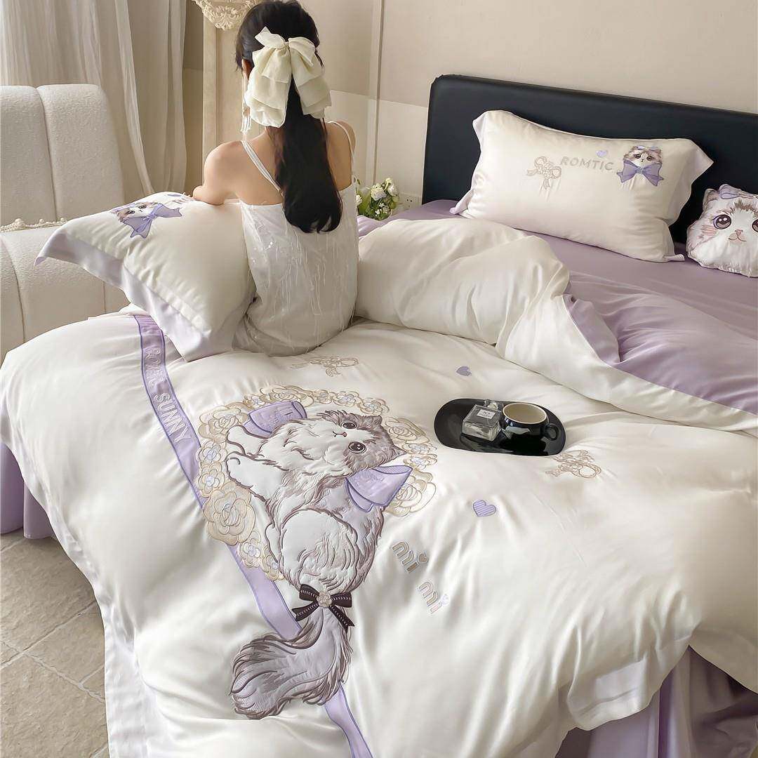 小可爱猫咪刺绣丝滑凉感亲肤透气床品夏季用莱赛尔天丝四件套