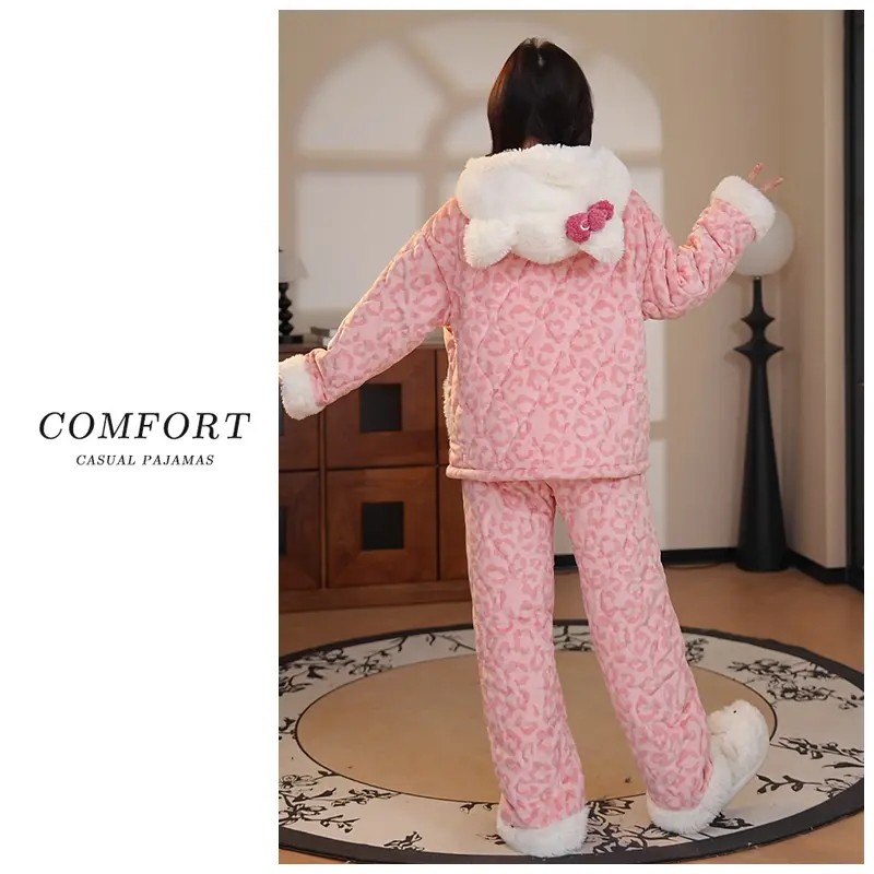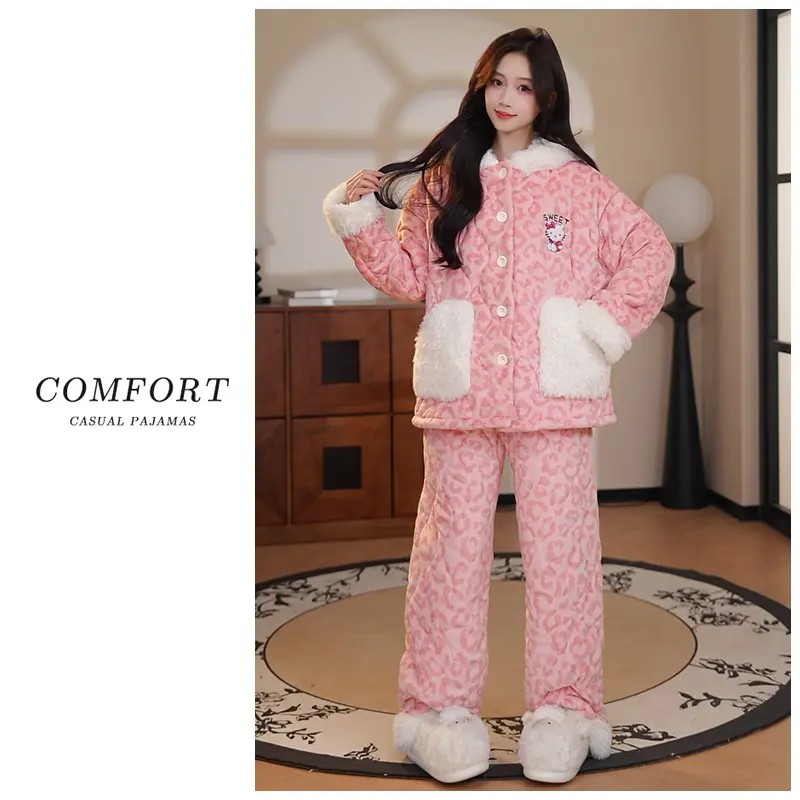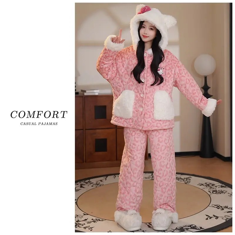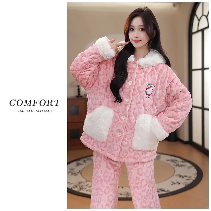 三层夹棉睡衣女款冬季加厚加绒珊瑚绒可爱女生凯蒂猫可外穿家居服