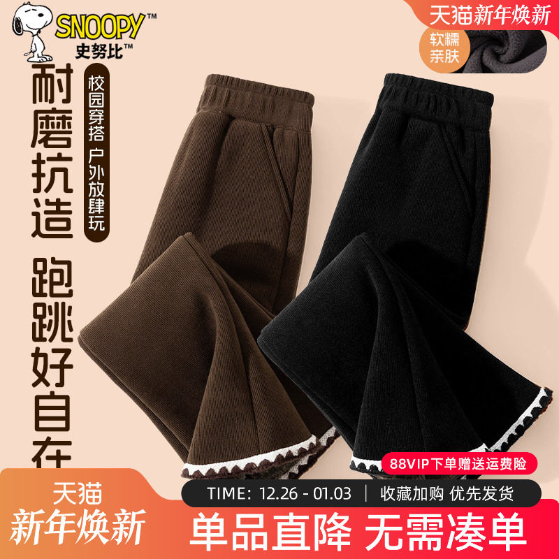 史努比女童加绒裤子2025新款大童秋冬款薄绒喇叭裤儿童冬装阔腿裤