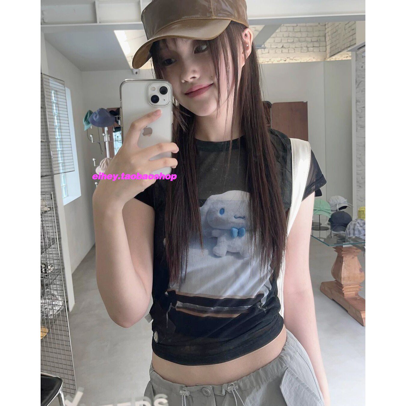 eihey诶嘿夏季薄款微透可爱印花短袖T恤设计感收腰修身辣妹风上衣