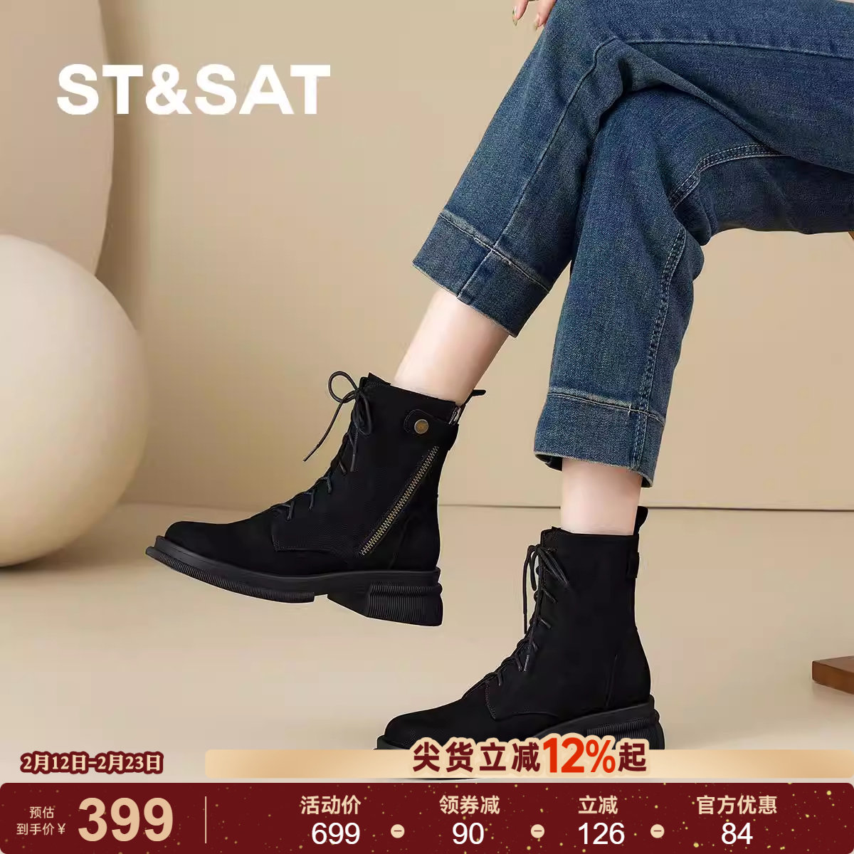 星期六2025新款黑色系带短靴女厚底马丁靴皮带扣机车靴厚底瘦瘦靴