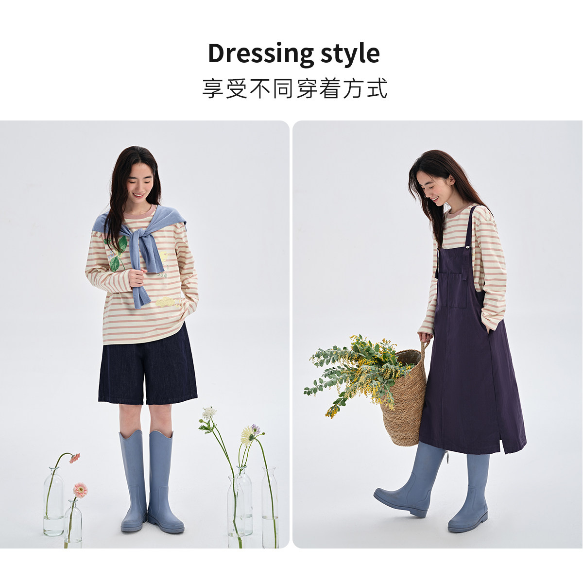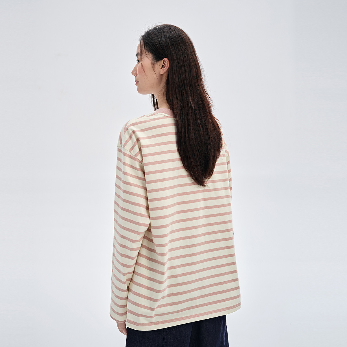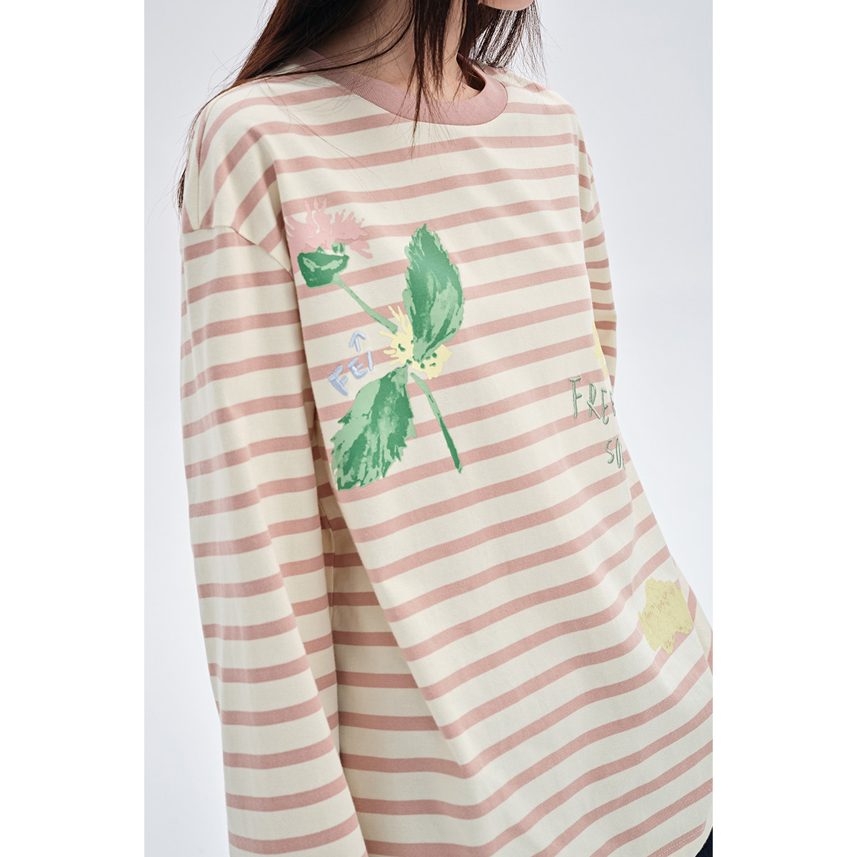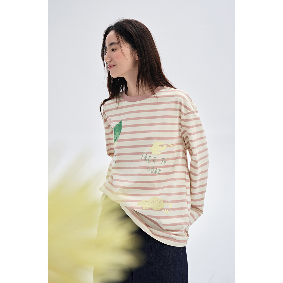 飞鸟和新酒长袖印花T恤女2025春季新款宽松圆领条纹休闲内搭上衣