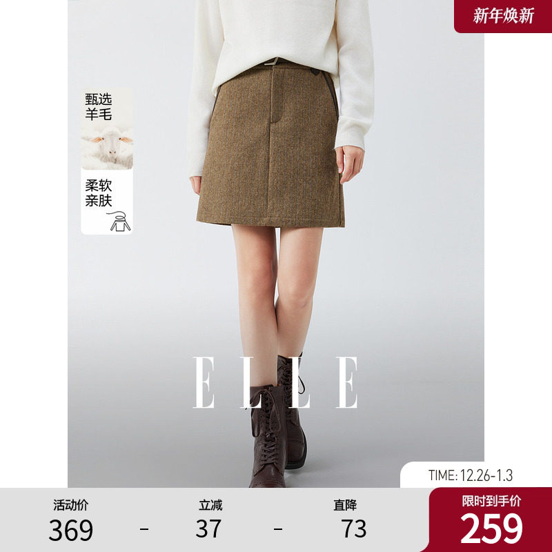 【祝绪丹同款】ELLE复古咖色半身裙女2025秋新款绵羊毛独特短裙子