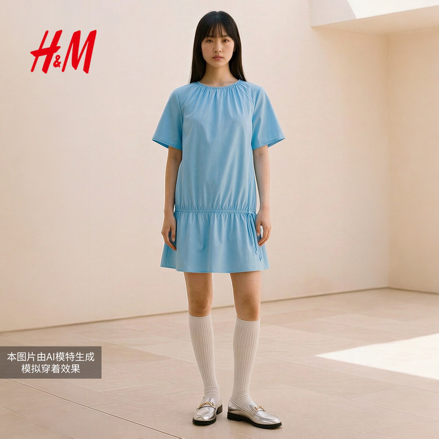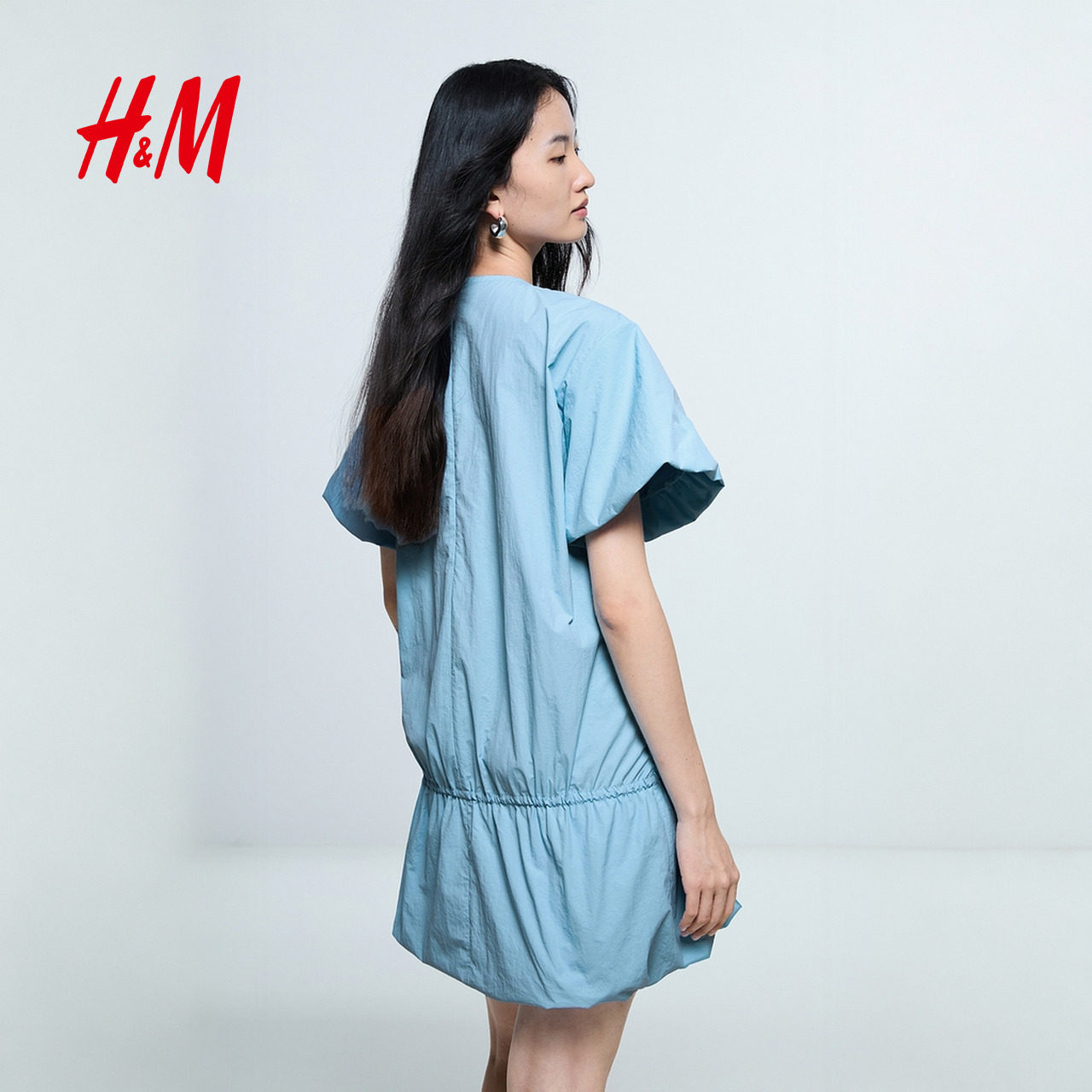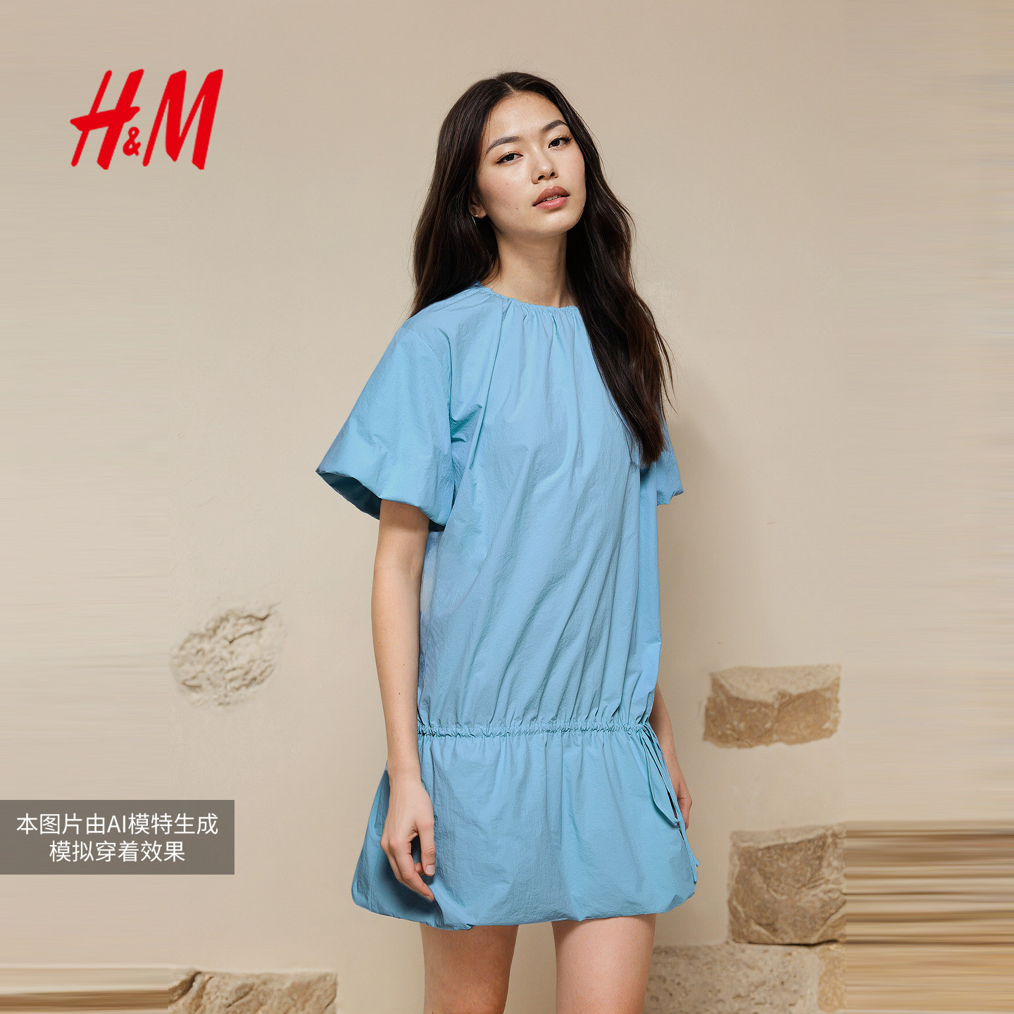 HM女装短袖连衣裙春季户外出游文艺低腰短袖泡泡袖连身裙1000014