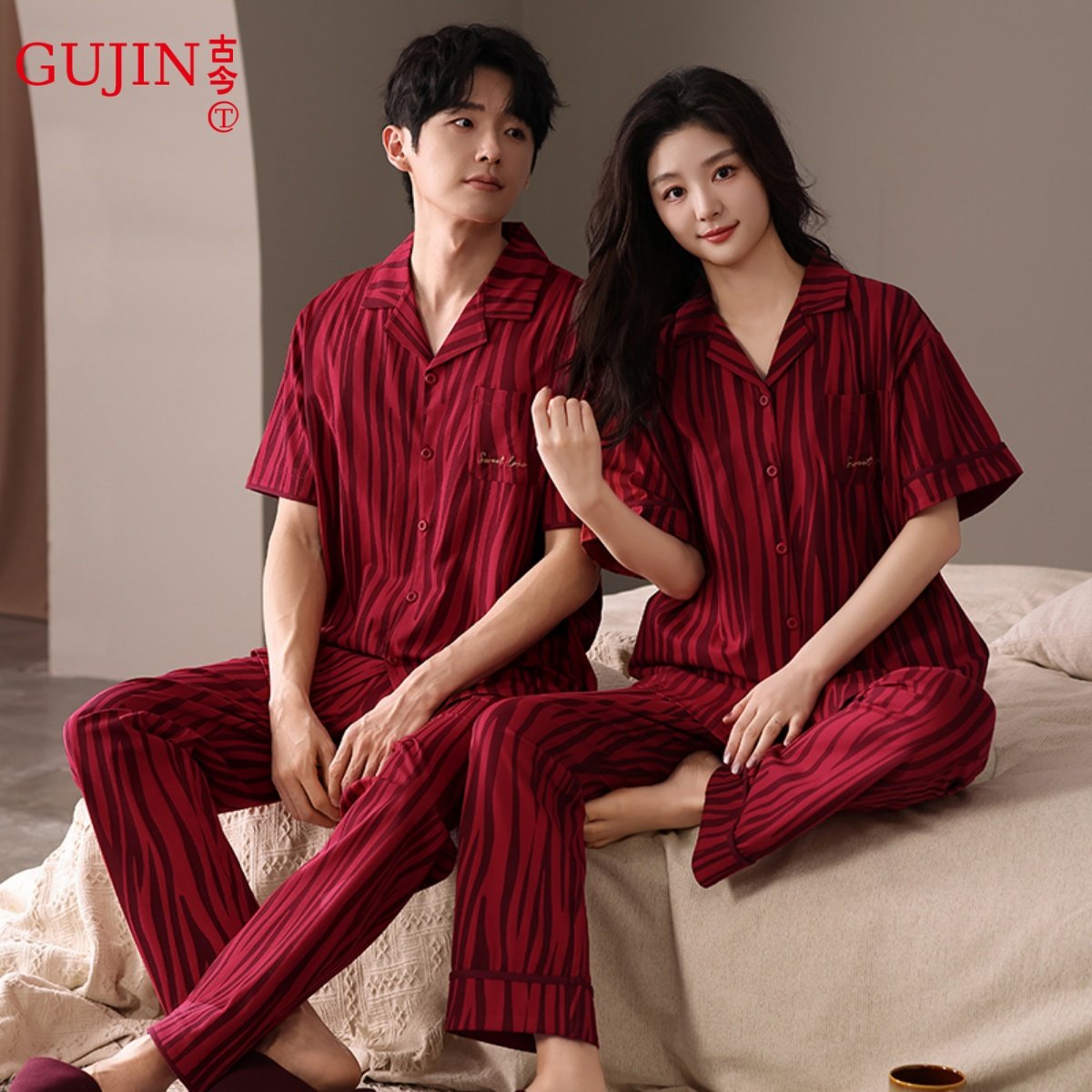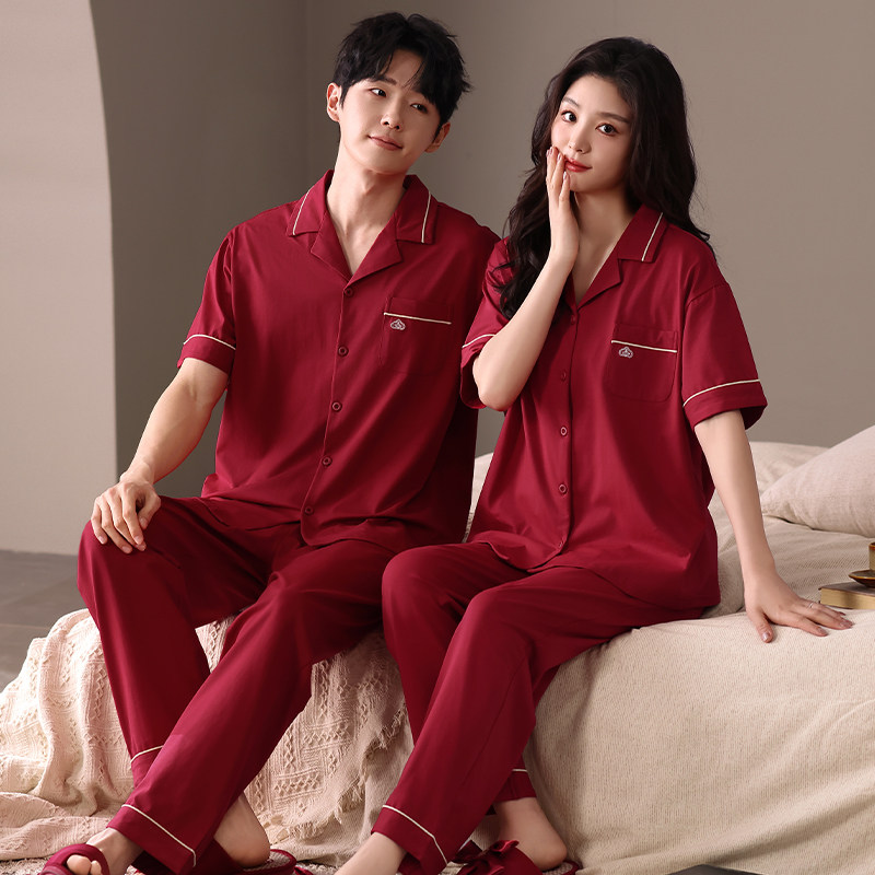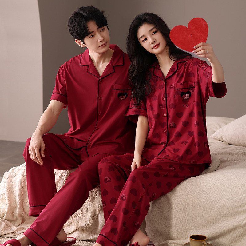 套装情侣睡衣夏短袖长裤纯棉男女大红色结婚新婚家居服本命年