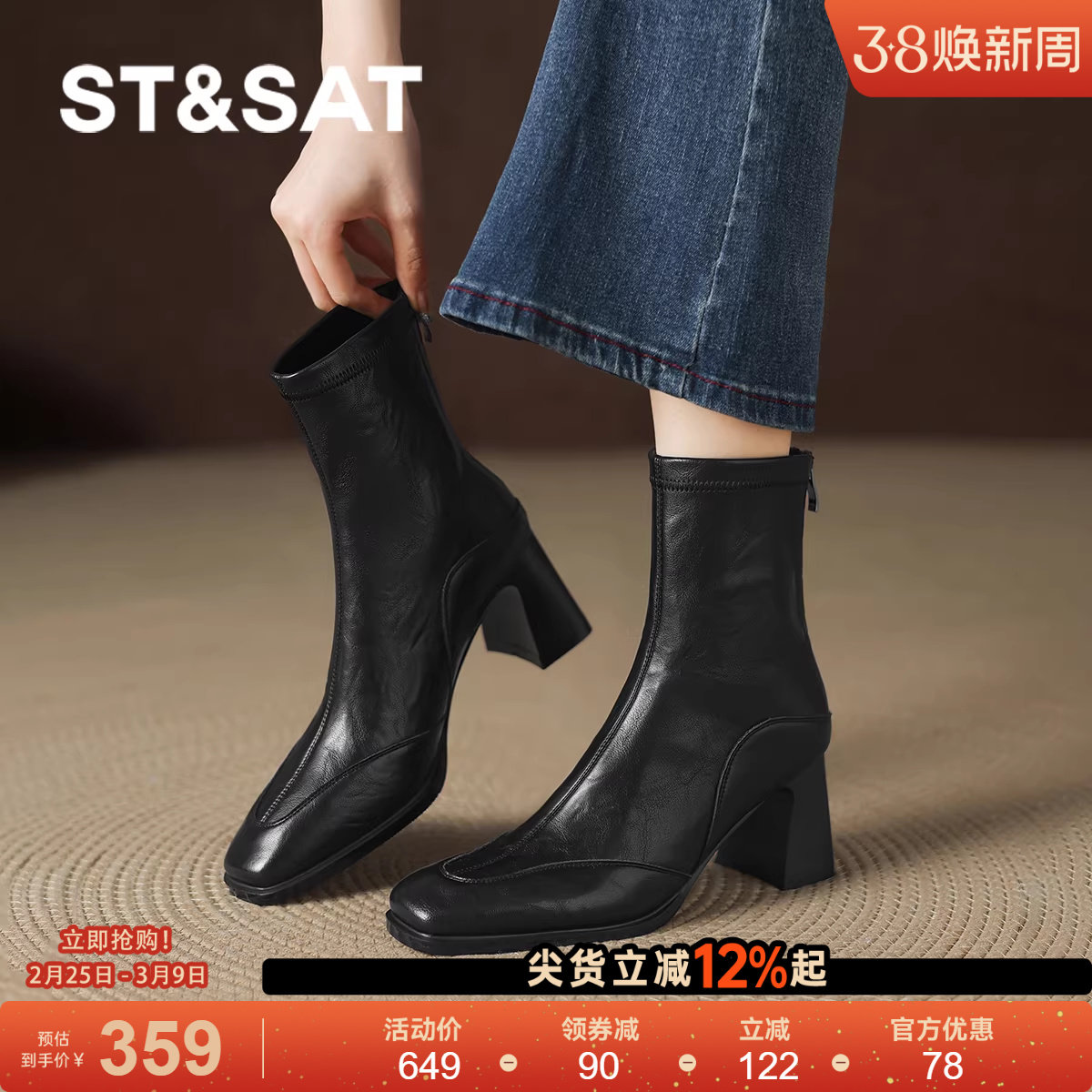 星期六高跟短靴女2025秋冬新款法式气质粗跟瘦瘦靴黑色高级感靴子