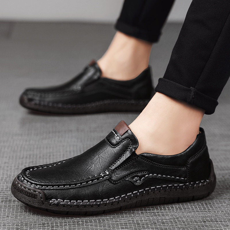 新款休闲皮鞋男真皮韩版潮流商务厚底轻质橡胶发泡底一脚蹬乐福鞋