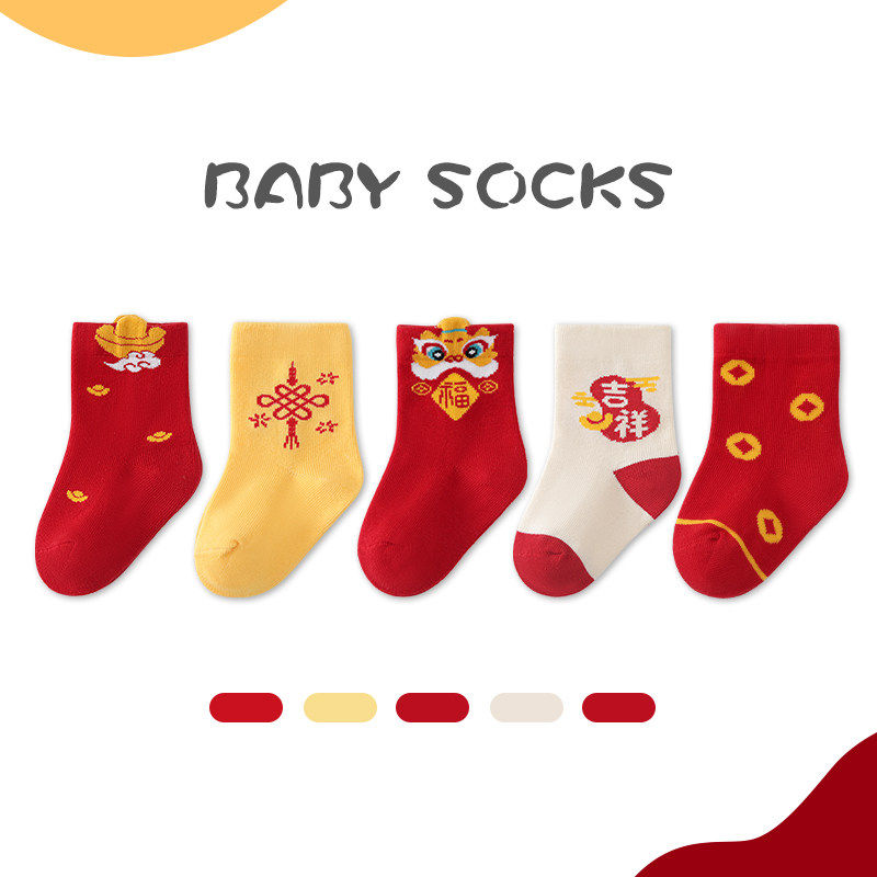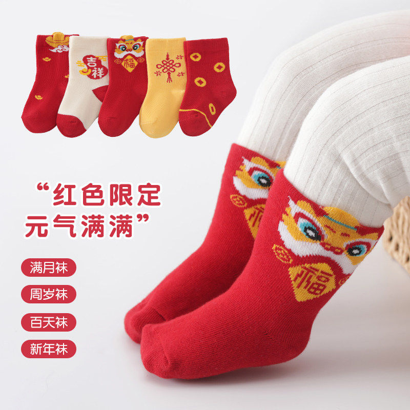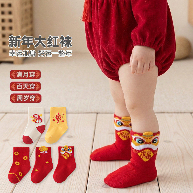 春秋婴儿棉感中国风满月百天周岁新年抓周红色男女童中筒短袜醒狮