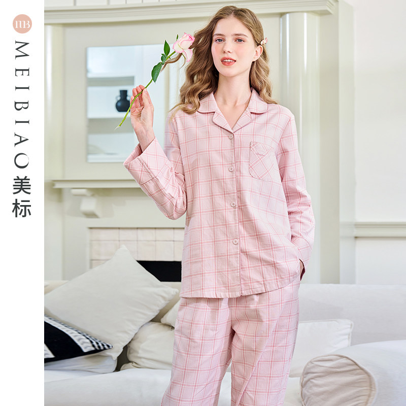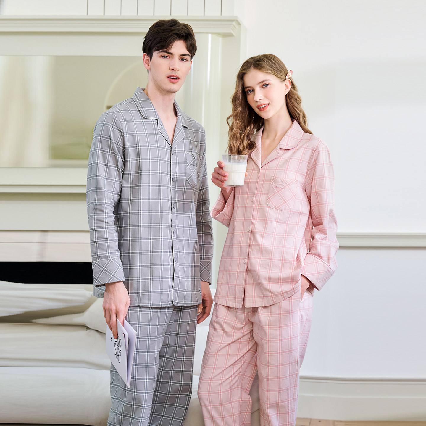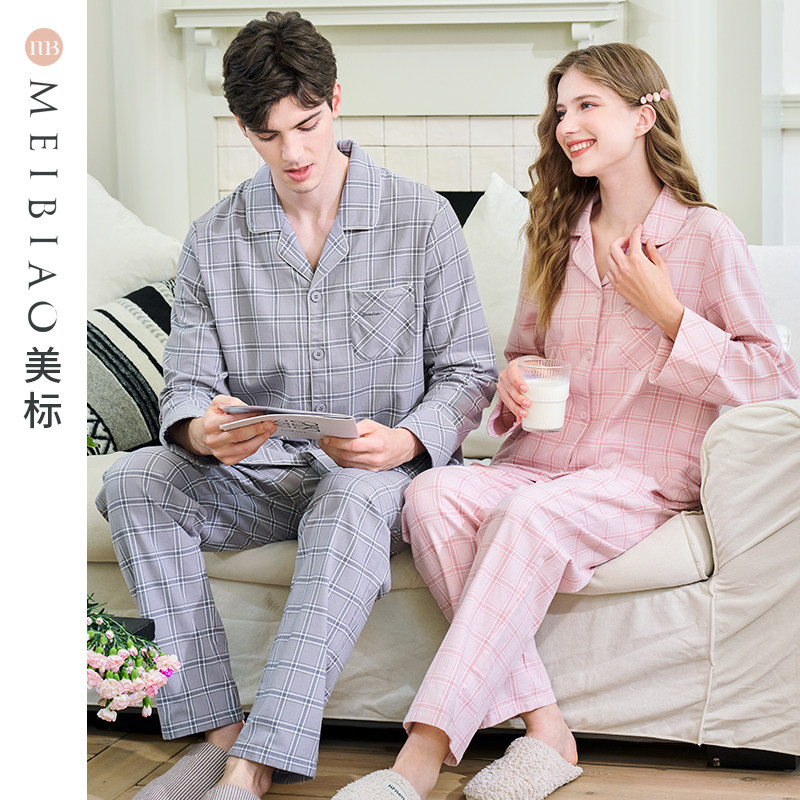 美标新款情侣纯棉睡衣套装女春秋款全棉休闲格子可外穿家居服男冬