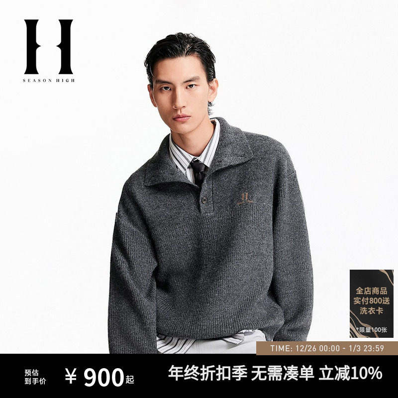 SEASON HIGH男装冬季毛衣针织衫纯色简约廓形立领纽扣刺绣上衣