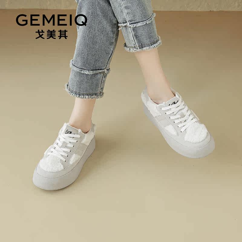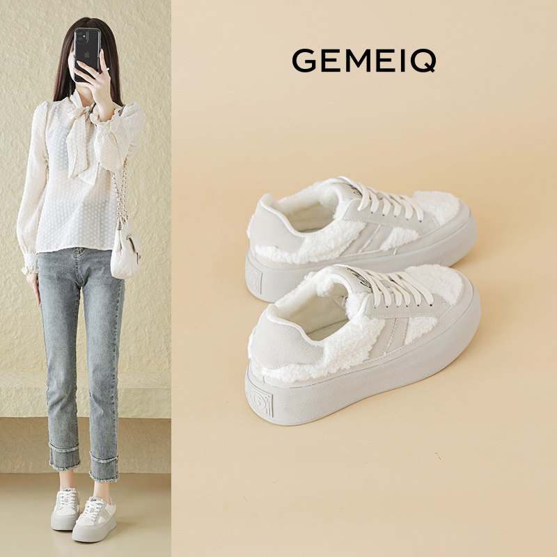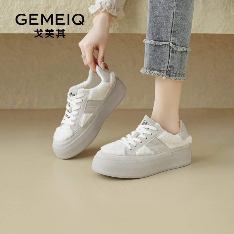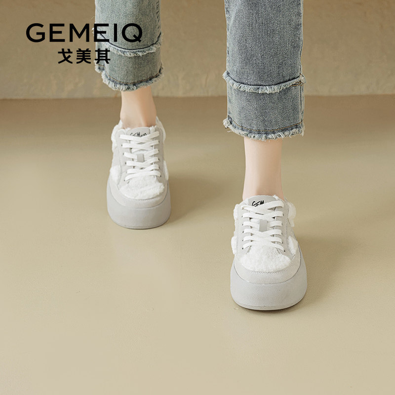 戈美其加绒学院风德训鞋女2024年秋冬新款平底松糕板鞋厚底小白鞋