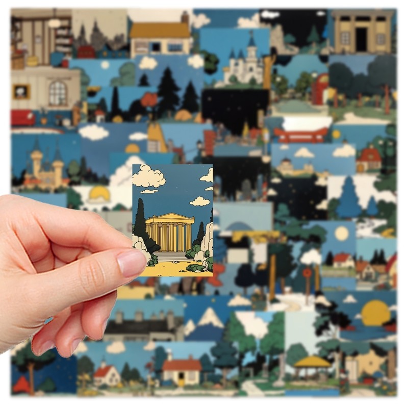 50张复古卡通风景贴纸清新简约优雅唯美插画装饰冰箱手机防水贴画DIY水杯手账可爱风景手账装饰手机冰箱贴画