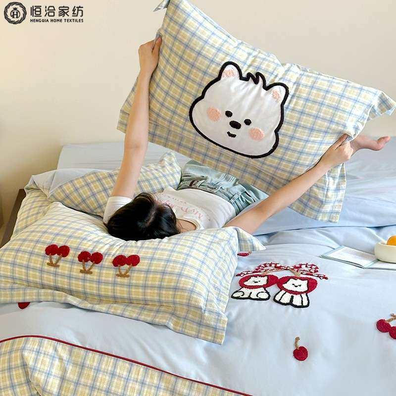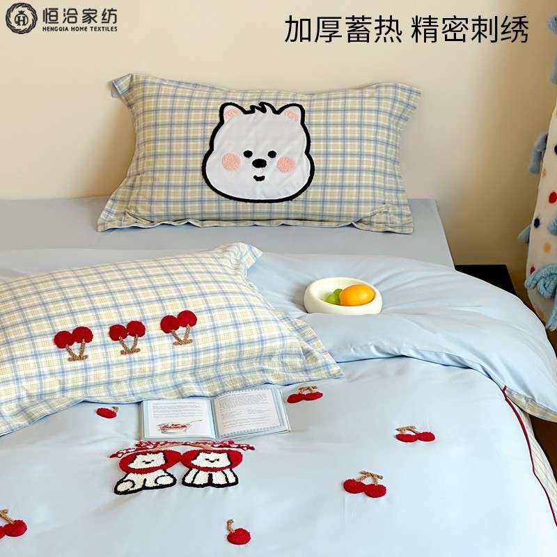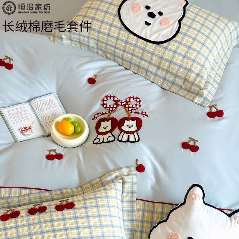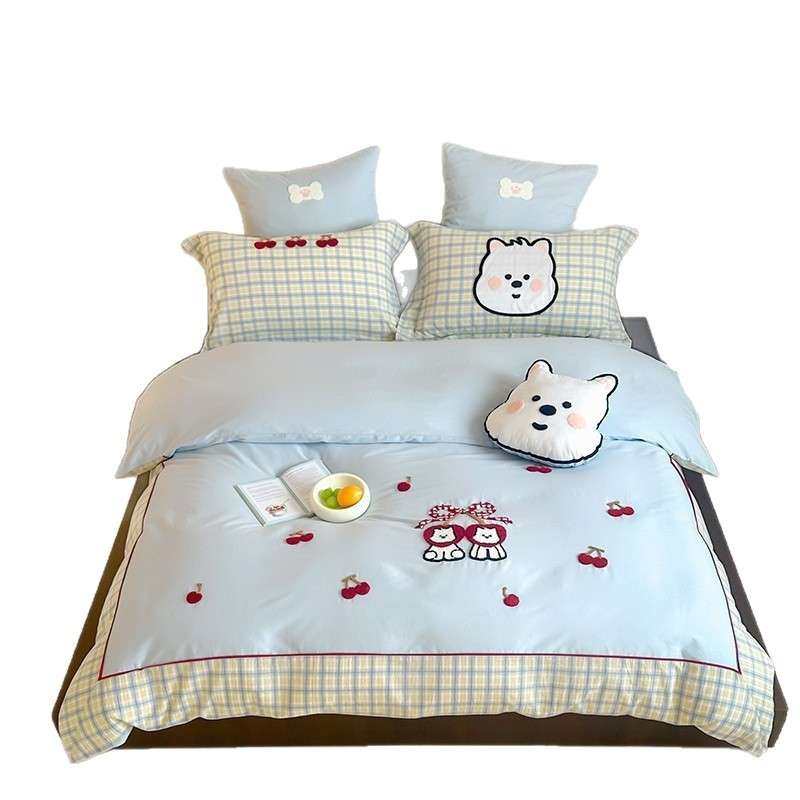 小清新纯棉磨毛加厚四件套樱桃狗毛巾绣秋冬被套床上用品1.2蓝色