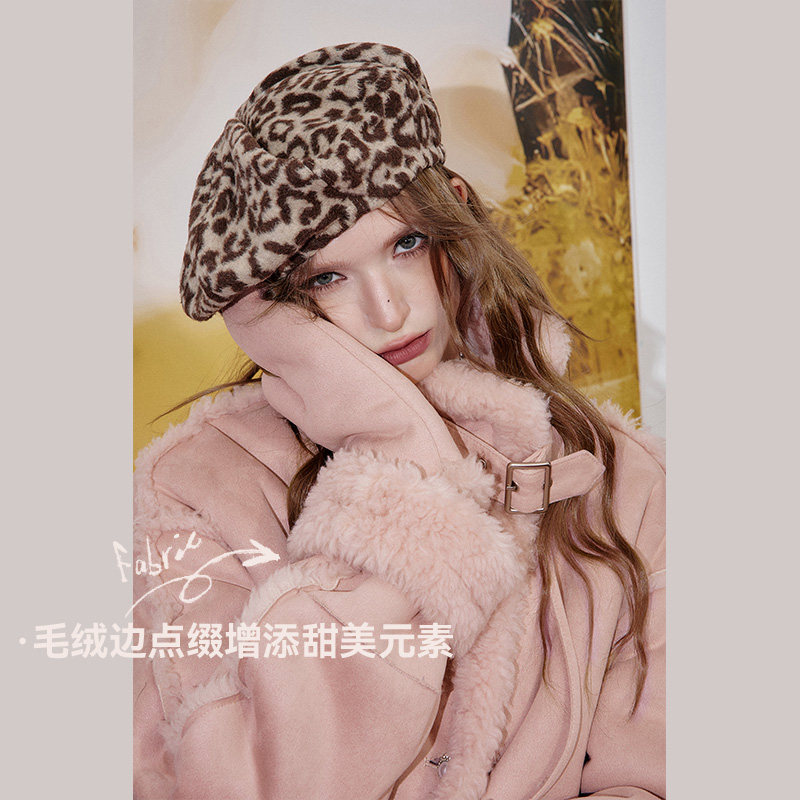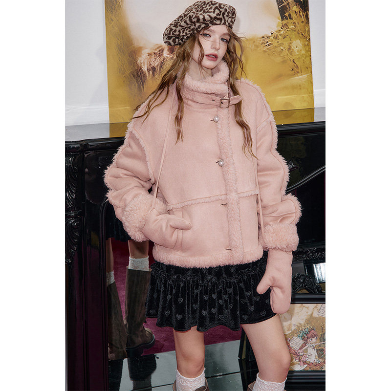 妖精的口袋粉色毛绒拼接麂皮毛呢外套女2025冬季新款甜酷皮毛一体