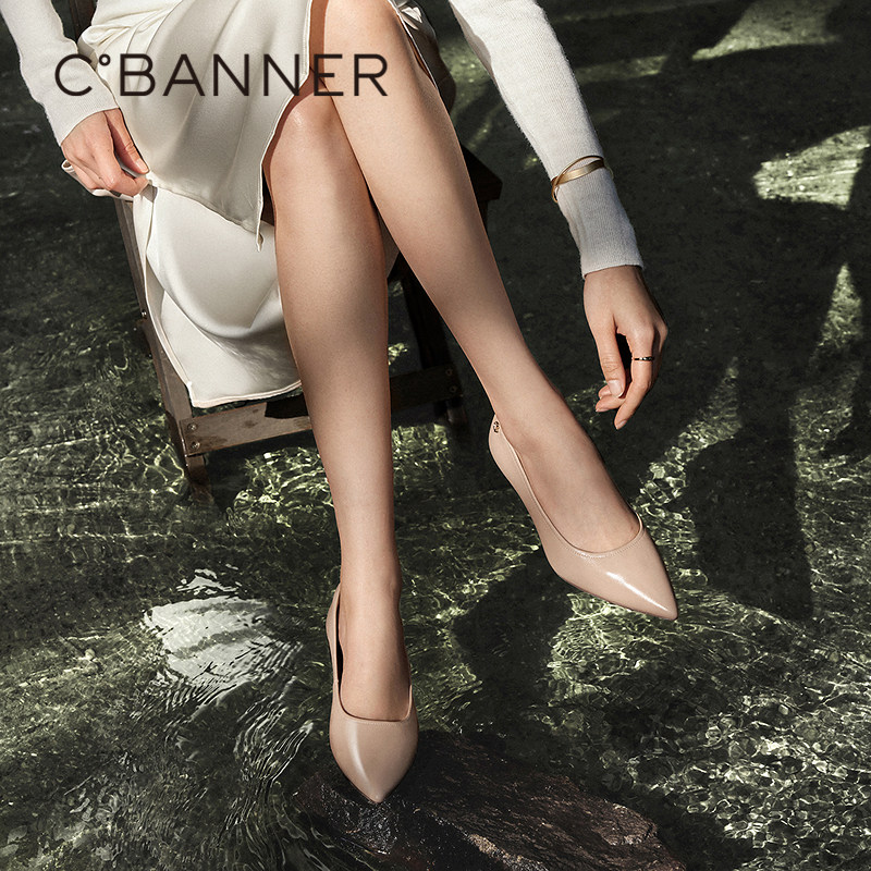 千百度羊皮裸色细高跟鞋女2025秋季新款尖头通勤浅口气质法式单鞋