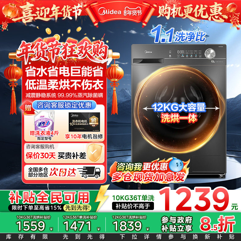 全民政府补贴美的12/10kg除菌全自动大容量洗脱烘一体滚筒洗衣机