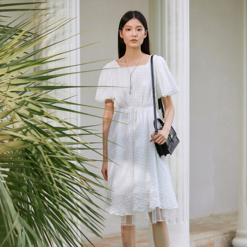 方领连衣裙 泡泡袖收腰 网纱拼接