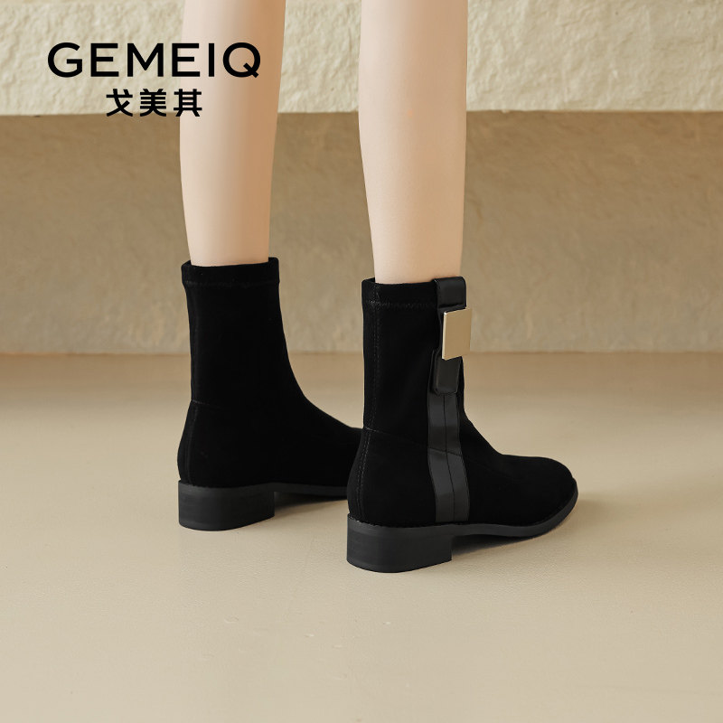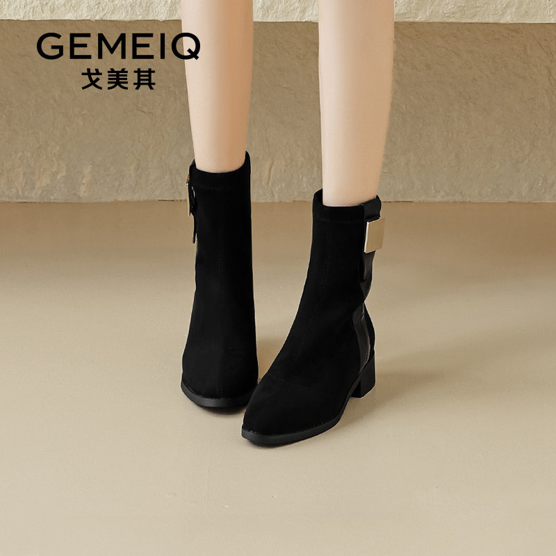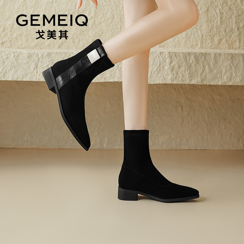 戈美其尖头瘦瘦靴女款舒适春秋新款单靴针织绒面弹力靴子粗跟短靴