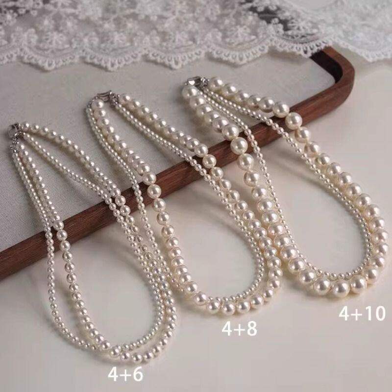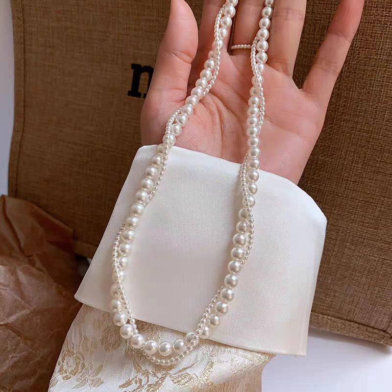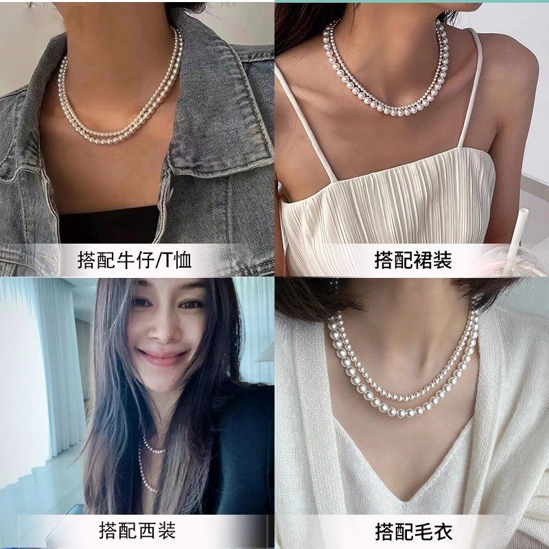 新款双层叠戴珍珠项链女休闲甜美气质锁骨链人造珍珠串珠多层颈链