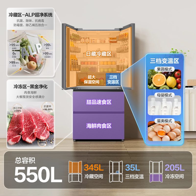 【双循环系统】海尔出品统帅冰箱550L法式多开门一级变频官方正品