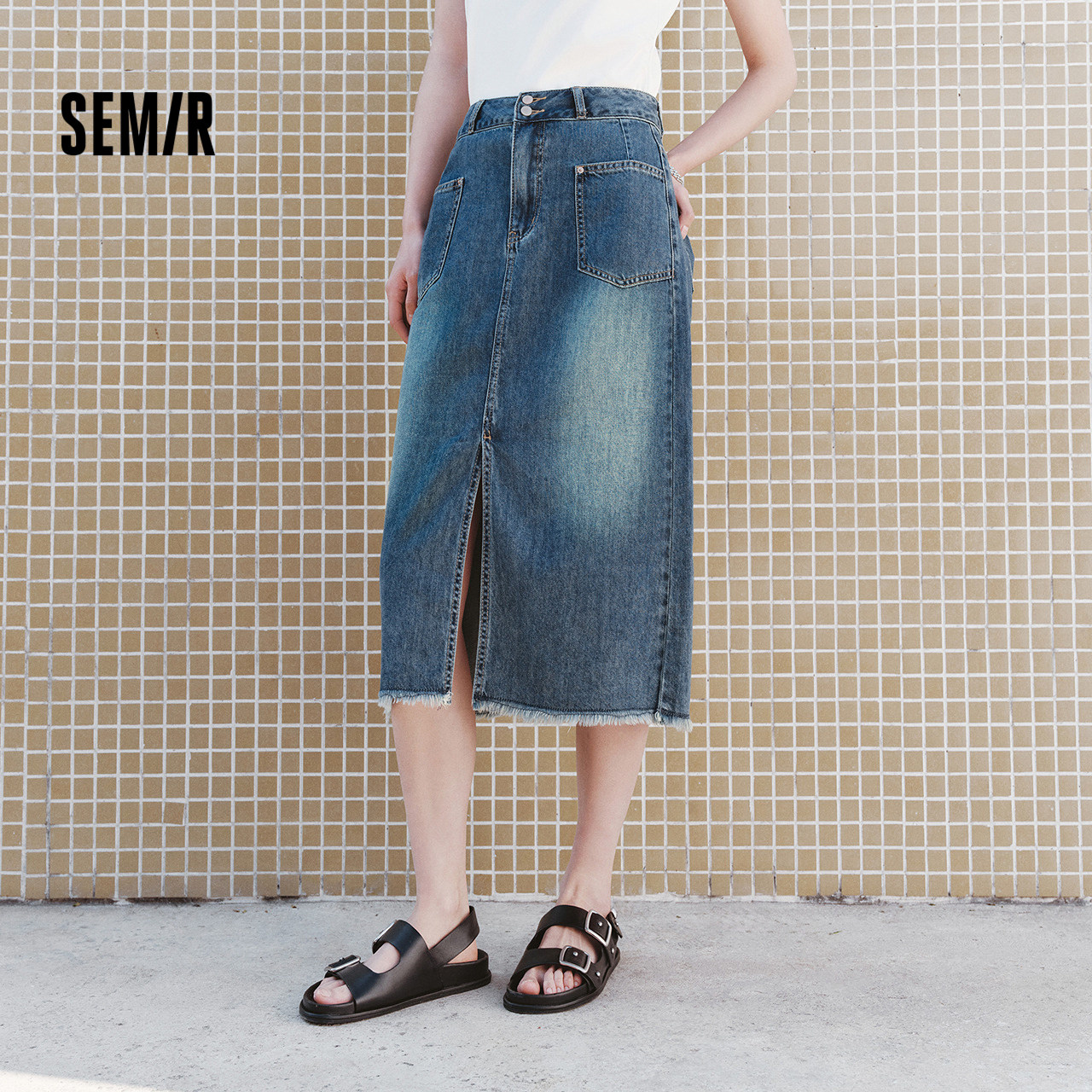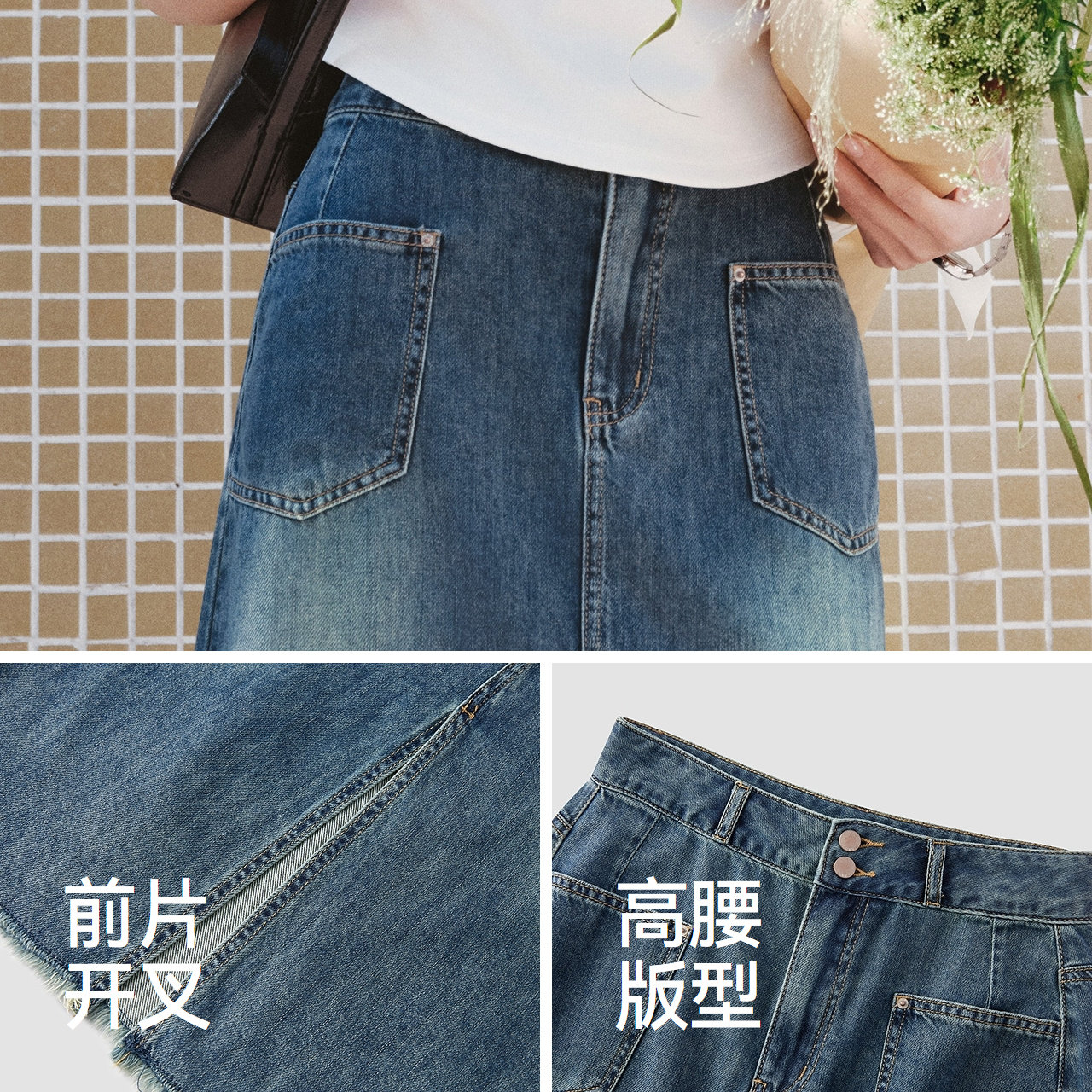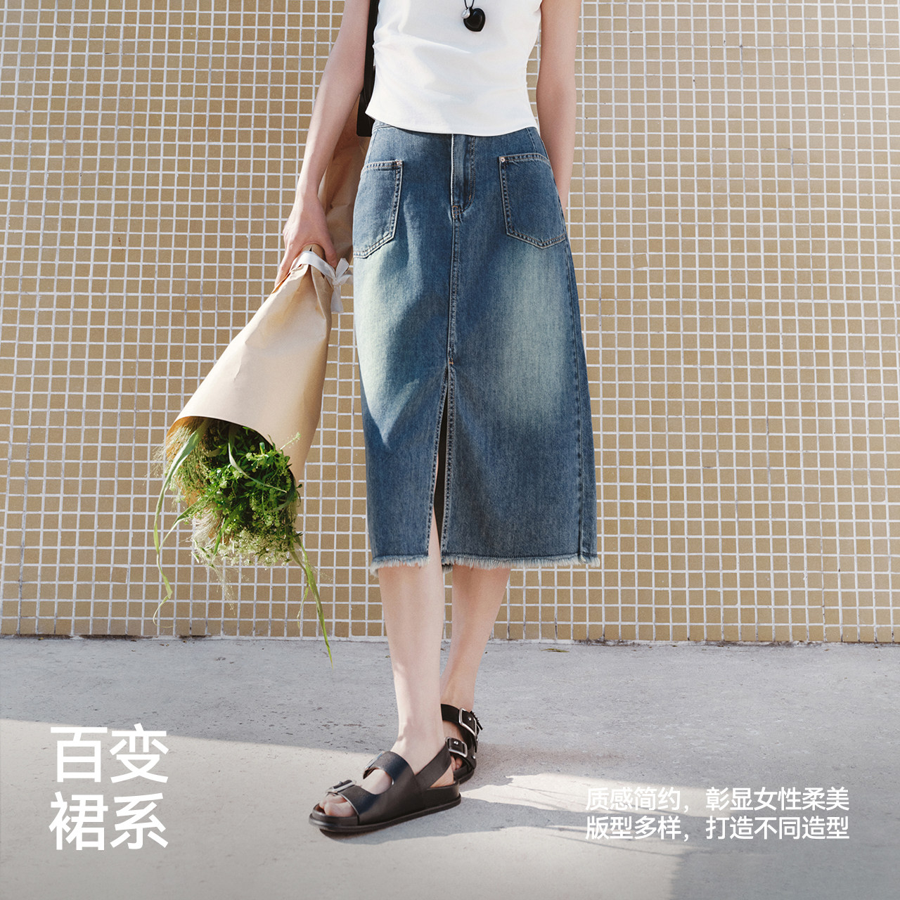 森柔|森马牛仔半身裙女夏季高腰开叉毛边长裙做旧复古潮流直筒裙
