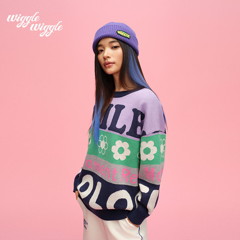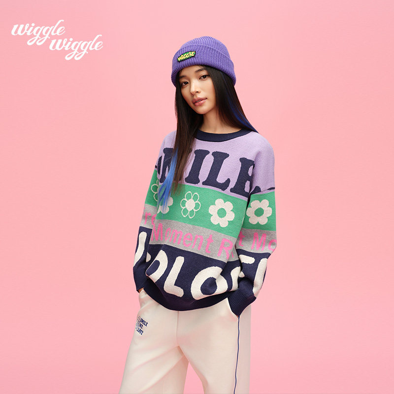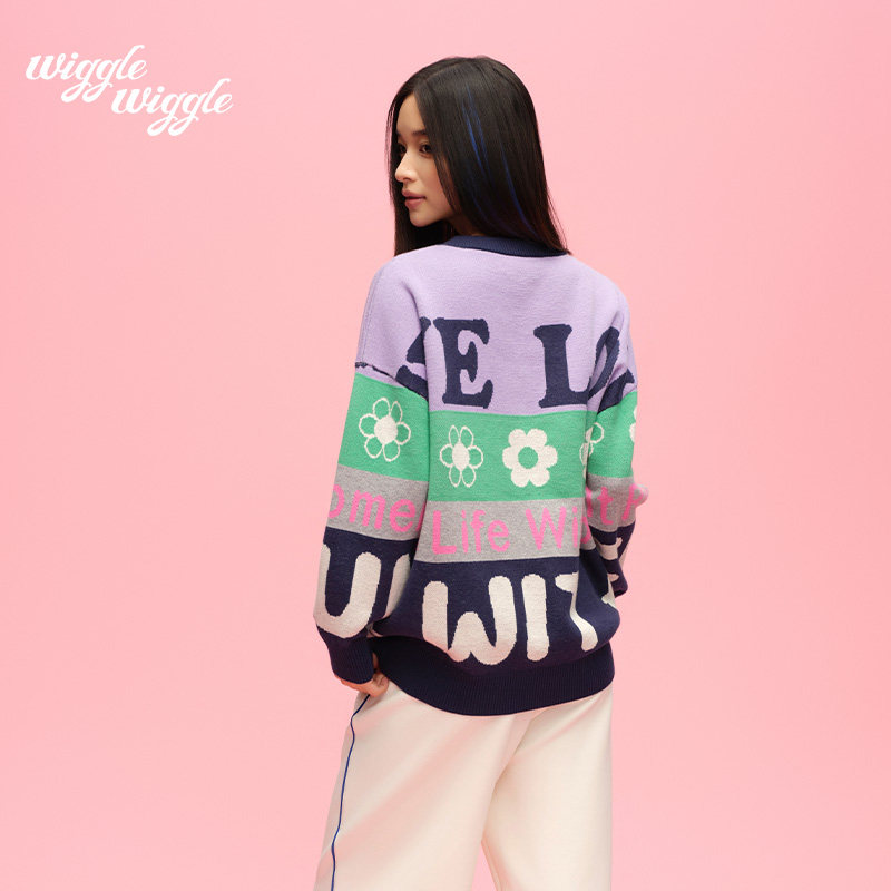 wigglewiggle26年春季潮牌复古拼色字母提花设计圆领针织毛衣女装