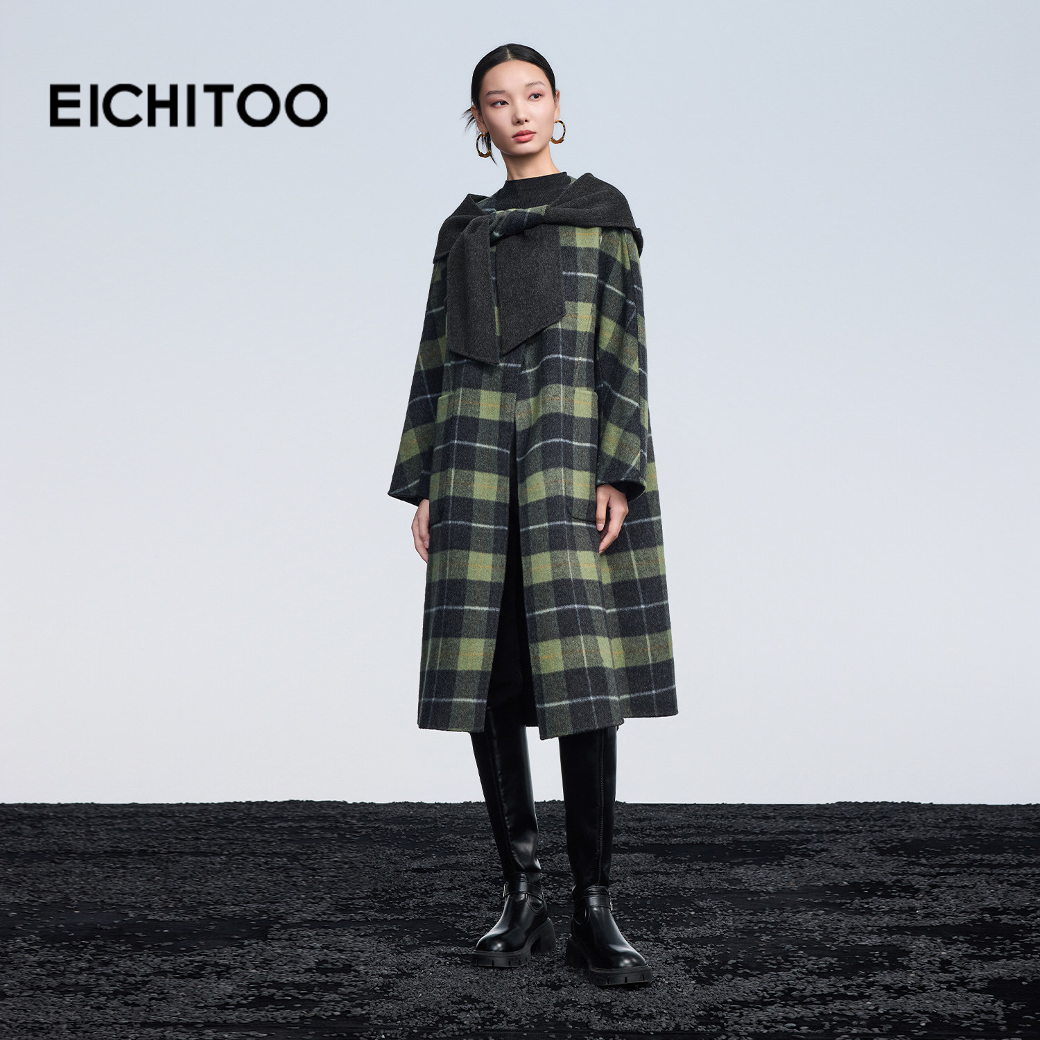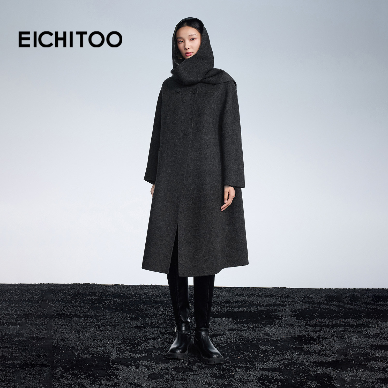爱居兔绵羊毛正反两穿双面呢大衣2025年冬季新款女连帽围巾大衣