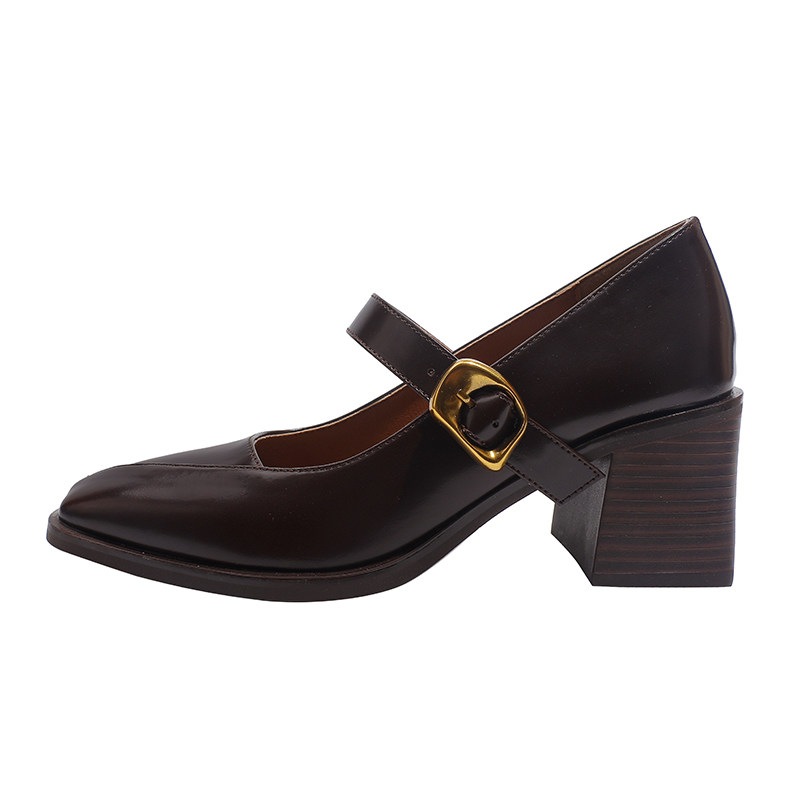 真皮~骄屿复古浅口高跟鞋山茶花一字扣粗跟单鞋尖头气质玛丽珍鞋