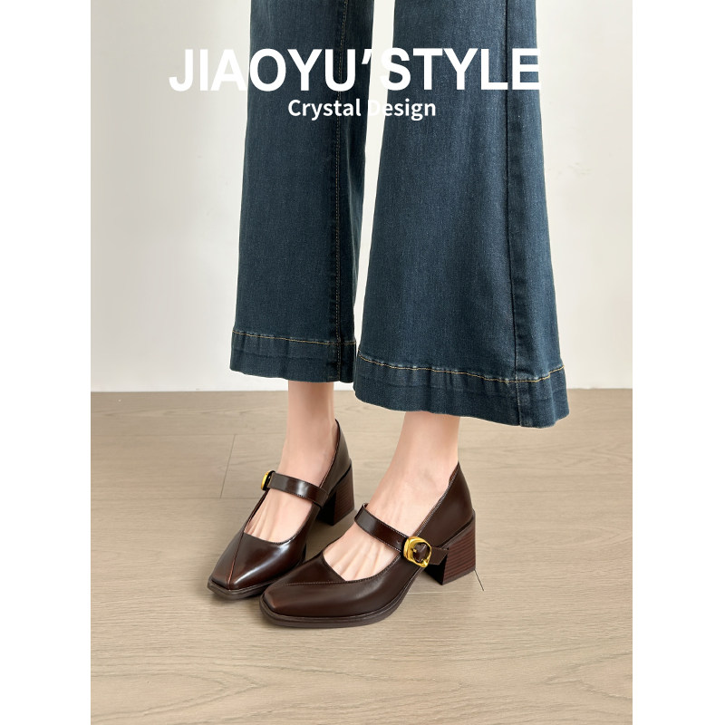 真皮~骄屿复古方头玛丽珍鞋女2026新款法式绝美粗高跟鞋通勤单鞋