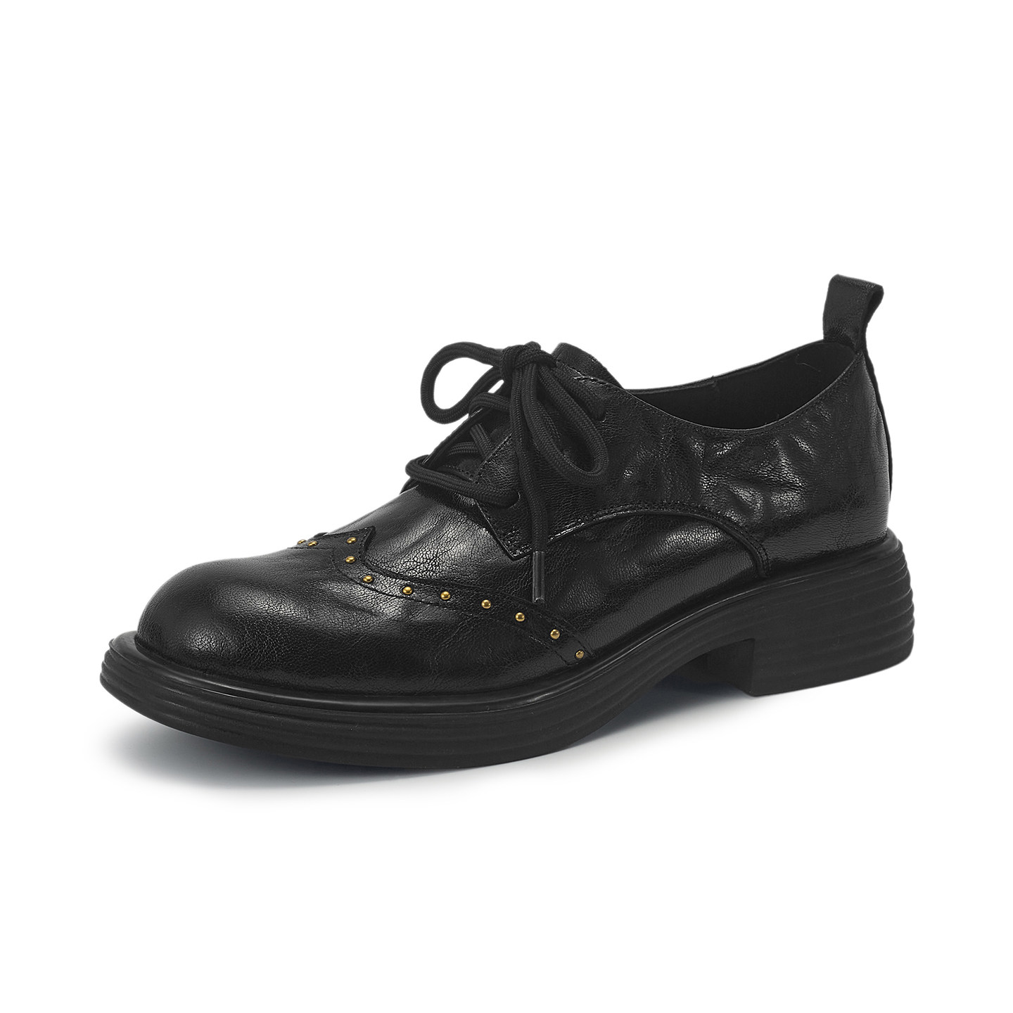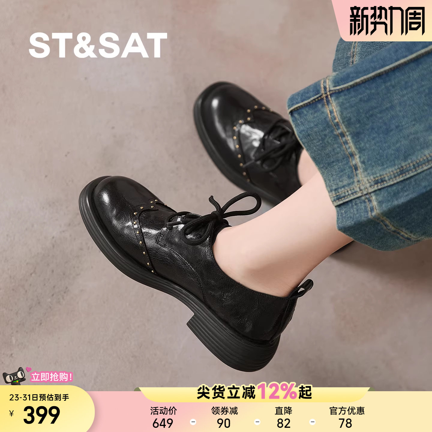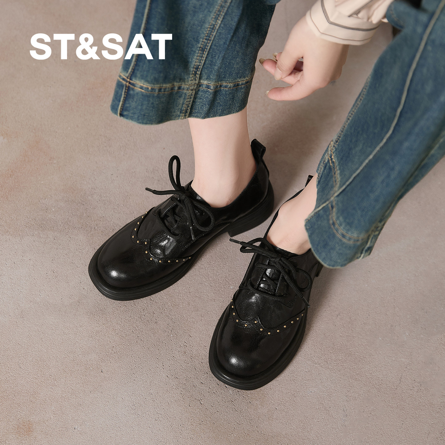 星期六乐福鞋女2026春新款英伦风黑色小皮鞋系带铆钉布洛克平底鞋
